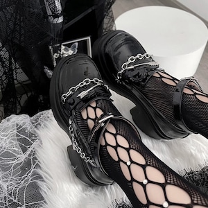 パンクなチェーン使いのハードさと、ハートモチーフの甘さが絶妙にミックスされた、地雷系・量産型女子必見の一足です。