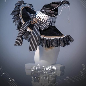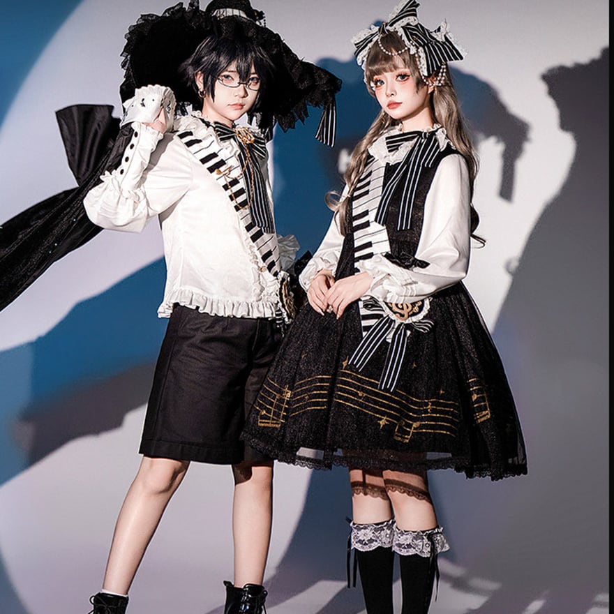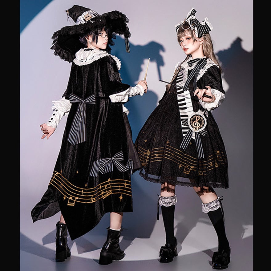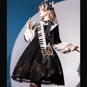 目を引くピアノの鍵盤を模したサッシュベルトや、音符が散りばめられたフリル襟が、クラシカルかつ独創的な世界観を演出します。