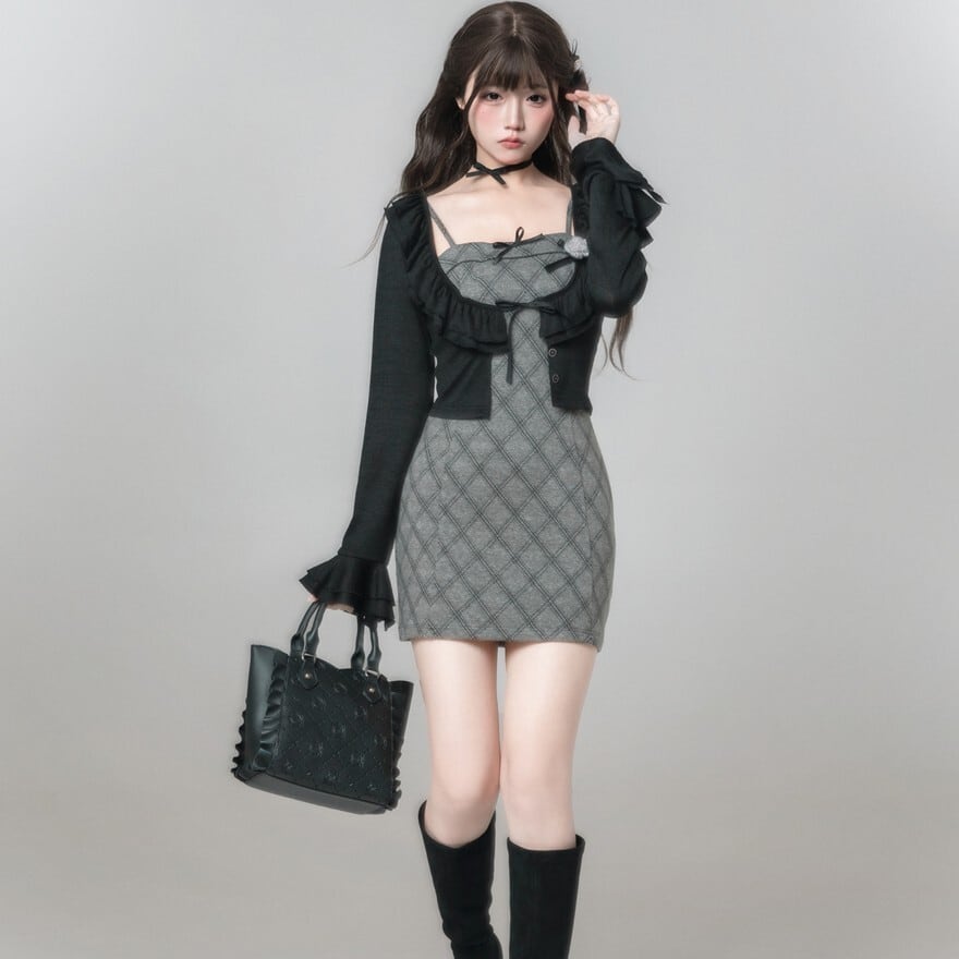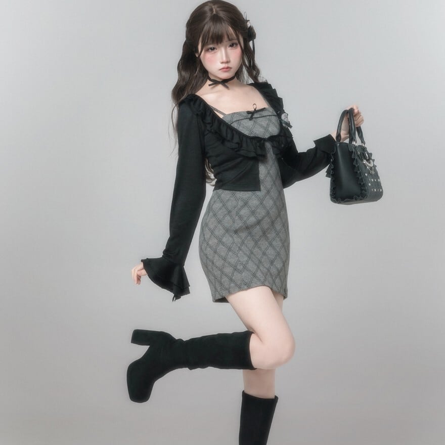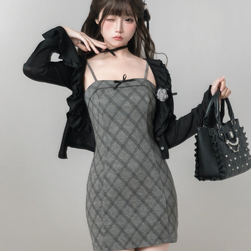 落ち着いたグレーとブラックのバイカラーが、洗練されたゴシック・モードを演出。 甘すぎないダイヤ柄のテキスタイルが、知的なお嬢様のような雰囲気を醸し出します。