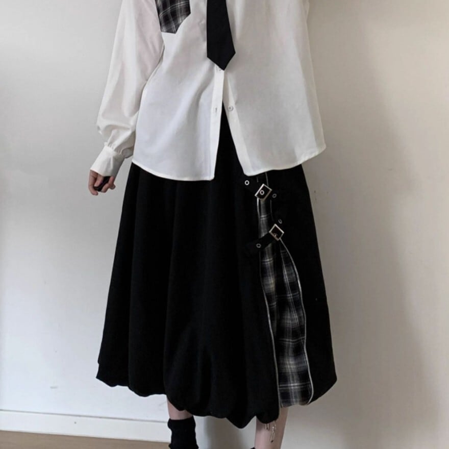 ふんわりとした丸みのあるバルーンシルエットが目を引く、パンキッシュなロングスカートです。サイドの大胆なジップを開くと、中から覗くモノトーンのチェック柄がアクセントに。ダブルバックルのベルトデザインが、地雷系やストリートファッションにスパイスを加え、個性的でボリュームのある足元を演出します。