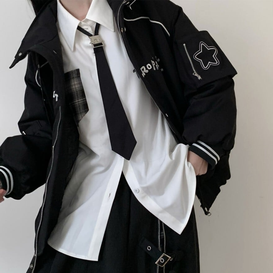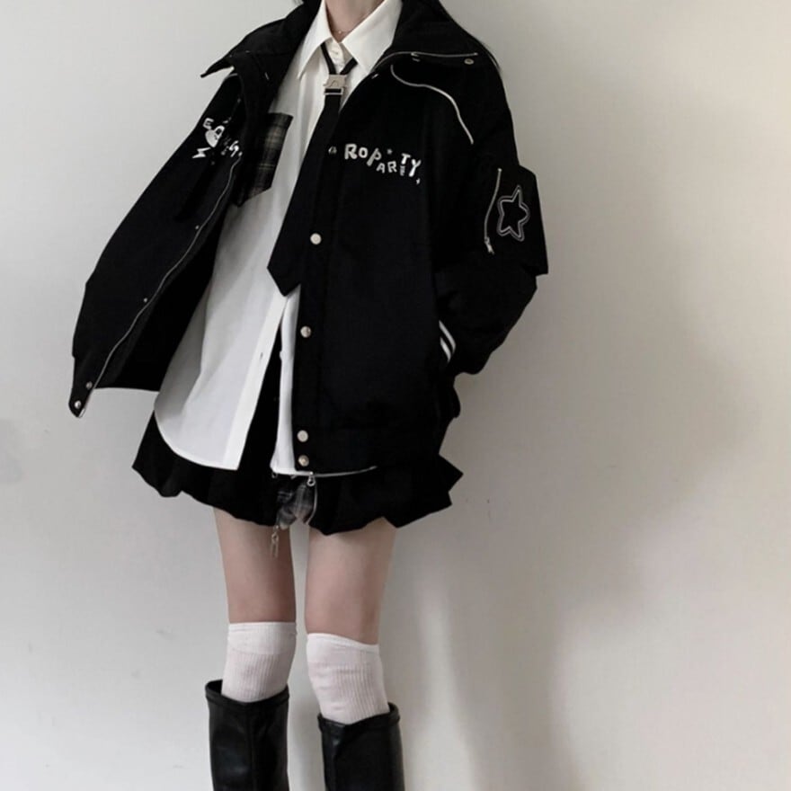 エッジの効いたサイバーパンク要素と、地雷系・量産型ファッションが融合したユニセックスブルゾンです。首元のボリューミーなベルト付きハイネックや、袖のタクティカルなバックル、星やキャラの刺繍がアクセント。ゆったりとしたオーバーサイズで、制服コーデやミニ丈ボトムスとも相性抜群な主役級の1着です。