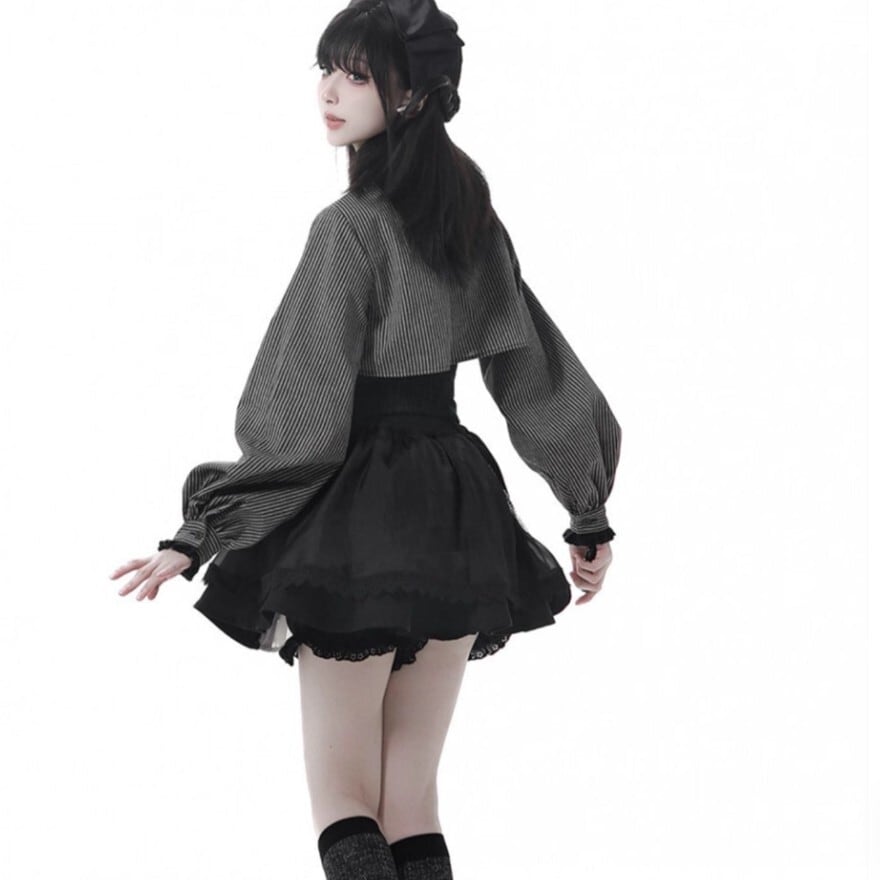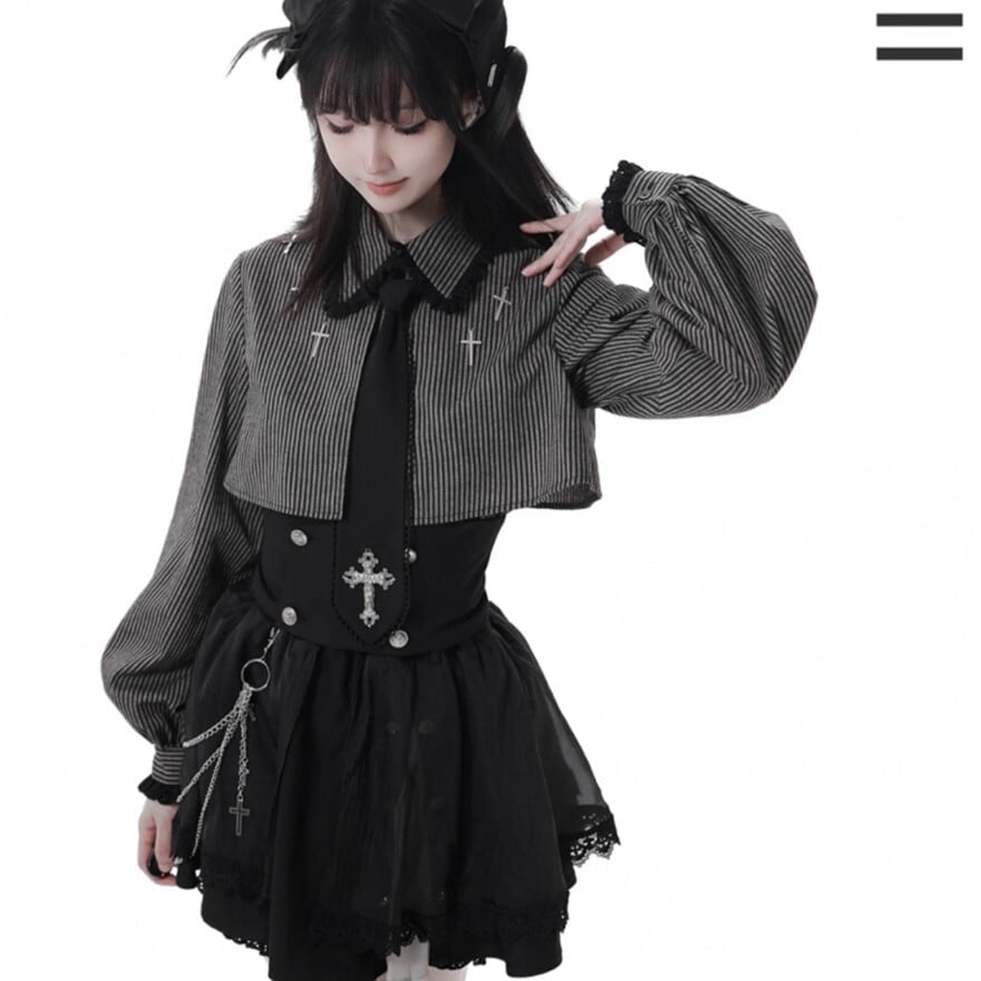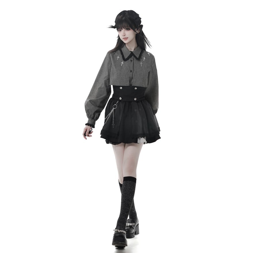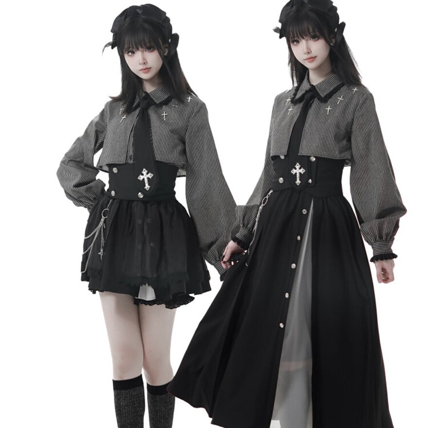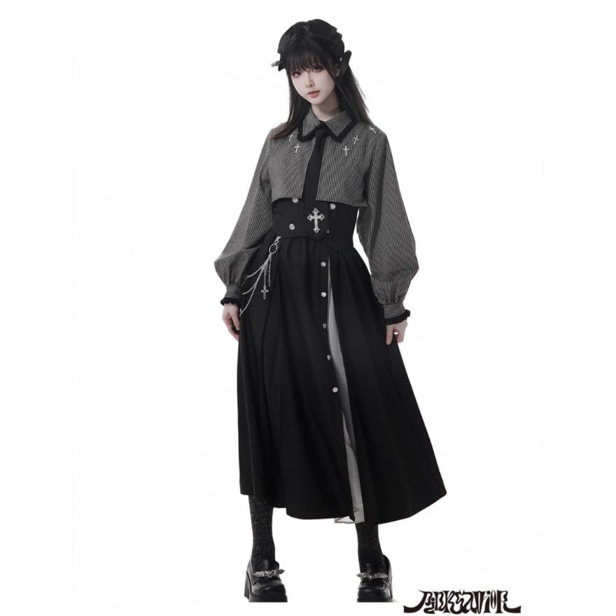 腰元にはパンキッシュな十字架チャーム付きの3連チェーンをあしらい、ダークな雰囲気を演出。縦に並んだシルバーボタンがアクセントになり、地雷系やゴシックファッションを格上げする、シルエットの美しい1着です。
