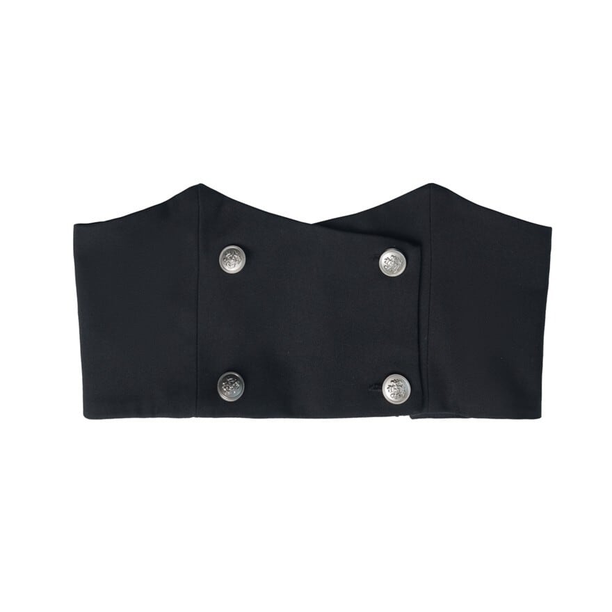 シックなブラックにメタルボタンのディテールが映えるコルセットは、ロリータコーデにエレガントなアクセントを加えます。