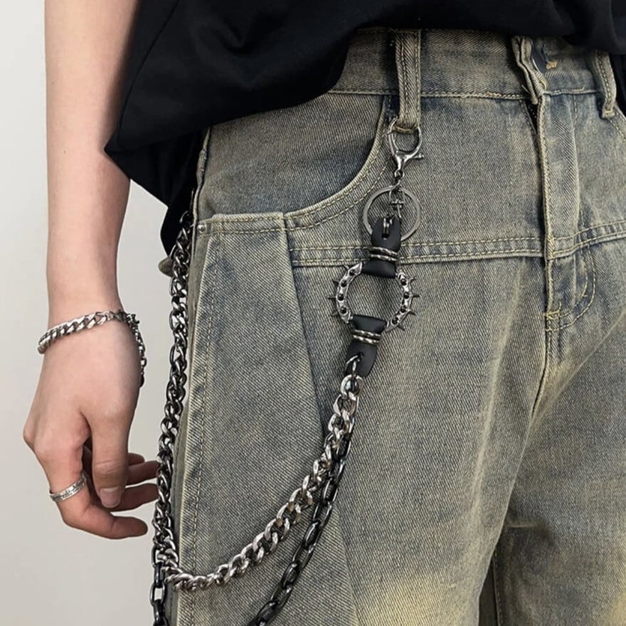 スパイク付きサークルリング: トゲ(スタッズ)があしらわれたリングが、パンクで反骨的なアクセントを演出。視線を腰回りに集めることで、スタイルにメリハリを与えます。