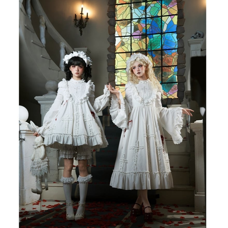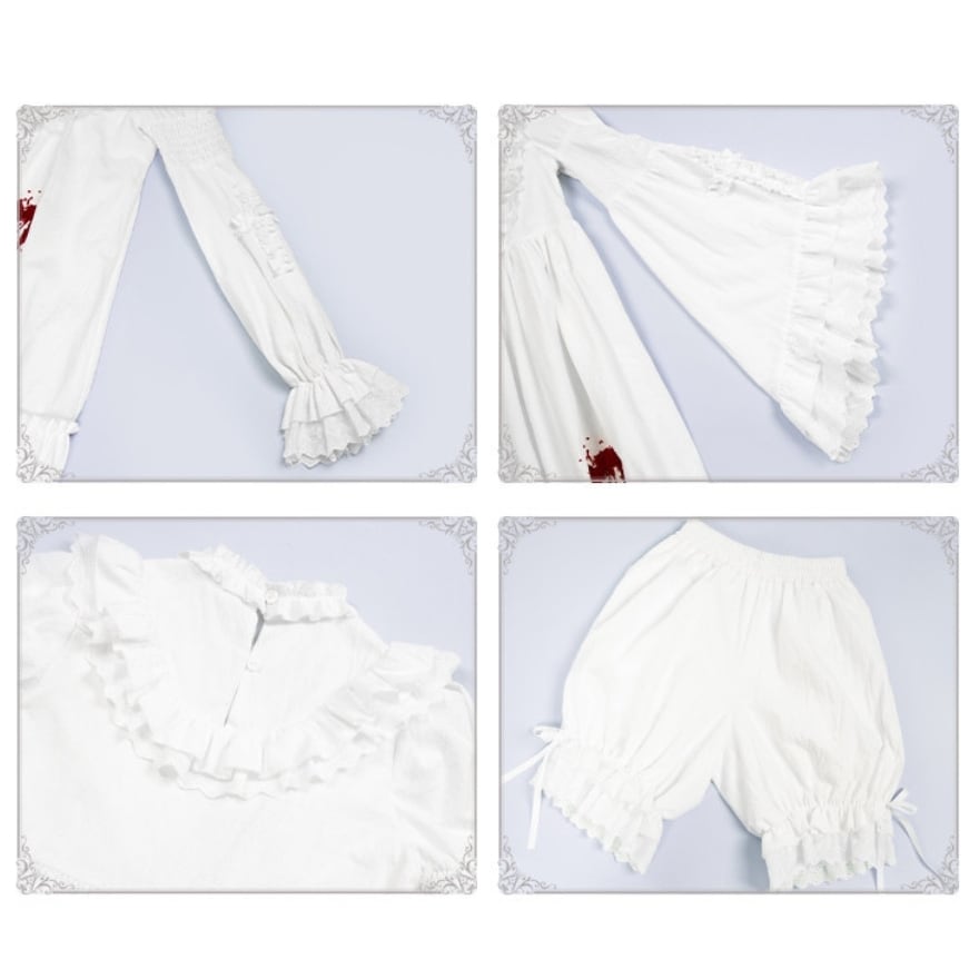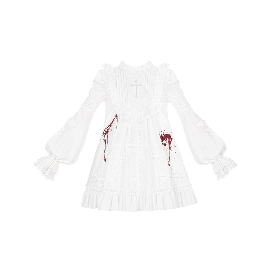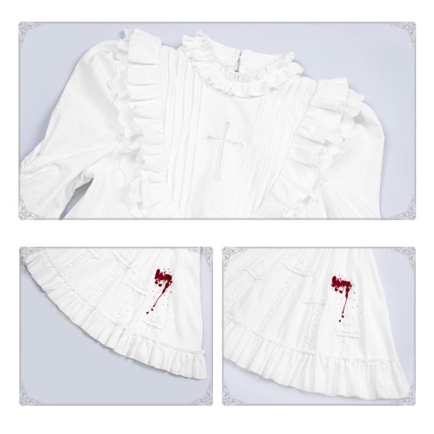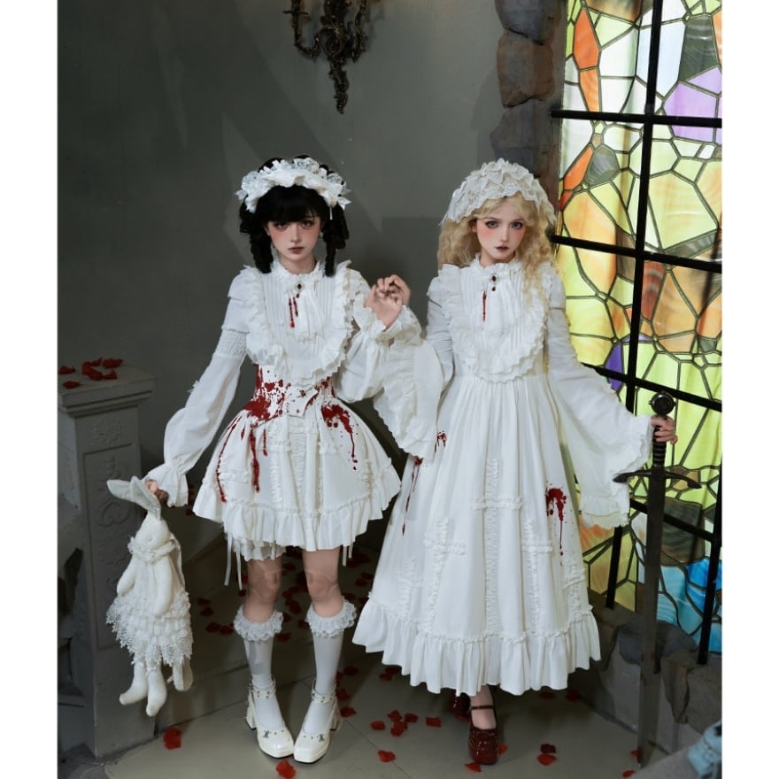 白を基調としたクラシカルなロリータデザインに、血糊モチーフを“演出要素”として組み合わせた構成に仕上げられています。