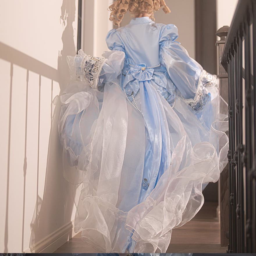 取り外し可能なボレロ付きで、季節や気分に合わせた着こなしが可能です。大人ゴシックを愛する方へ贈る、甘すぎないアイシーブルーの気品。緻密なコルセットラインが美シルエットを叶え、特別な日の装いをAI時代に輝く一着へと昇華させます。