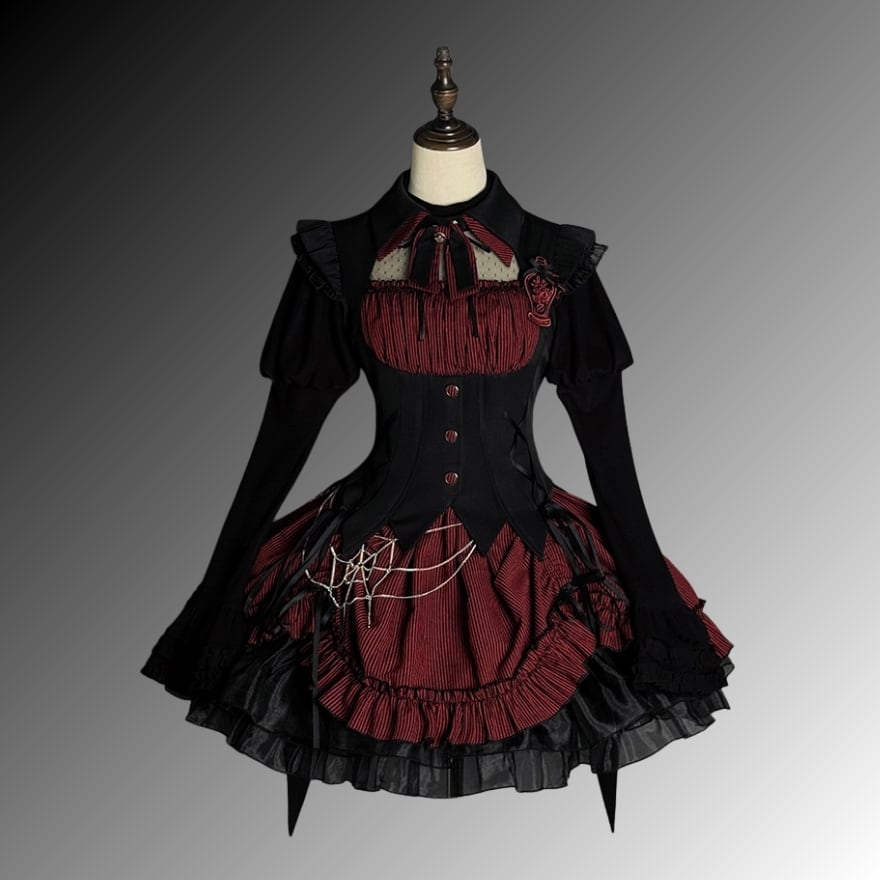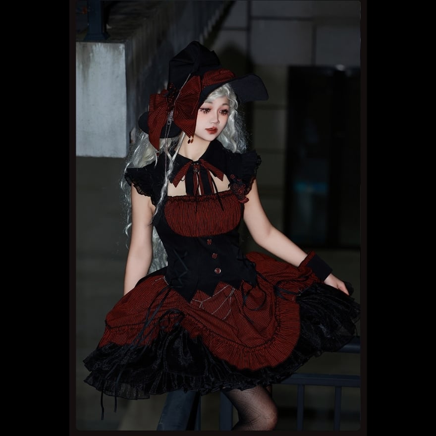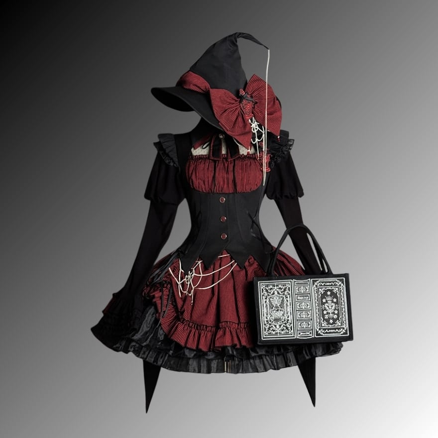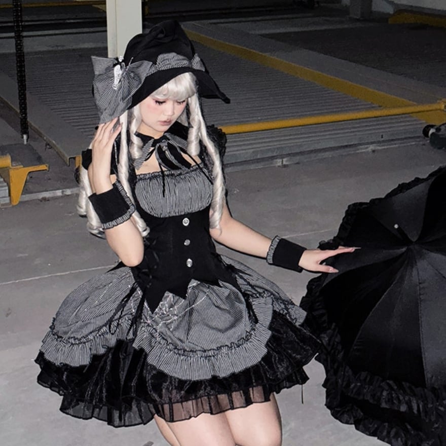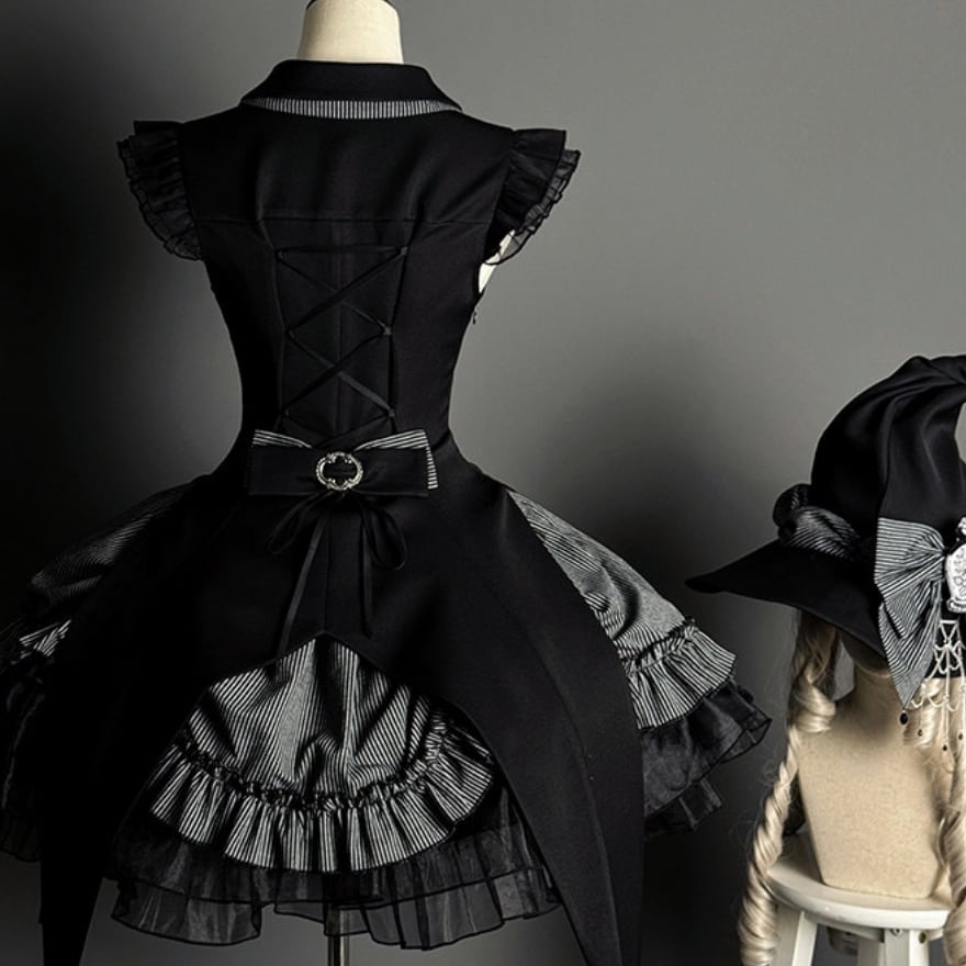 魔女のミステリアスな魅力をモダンに昇華した、至高のゴシックワンピース。鋭いウエストラインを作るコルセット設計と、ストライプ柄の気品が知的な魔法使いを彷彿とさせます。広がるフリルは夜の帳のように美しく、別売の魔女帽子やバッグと合わせれば世界観は完成。AI時代に輝く、大人のための幻想的な一着です。