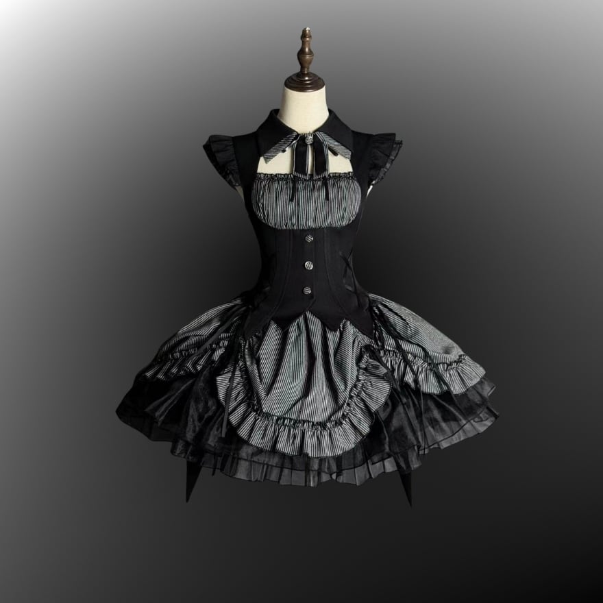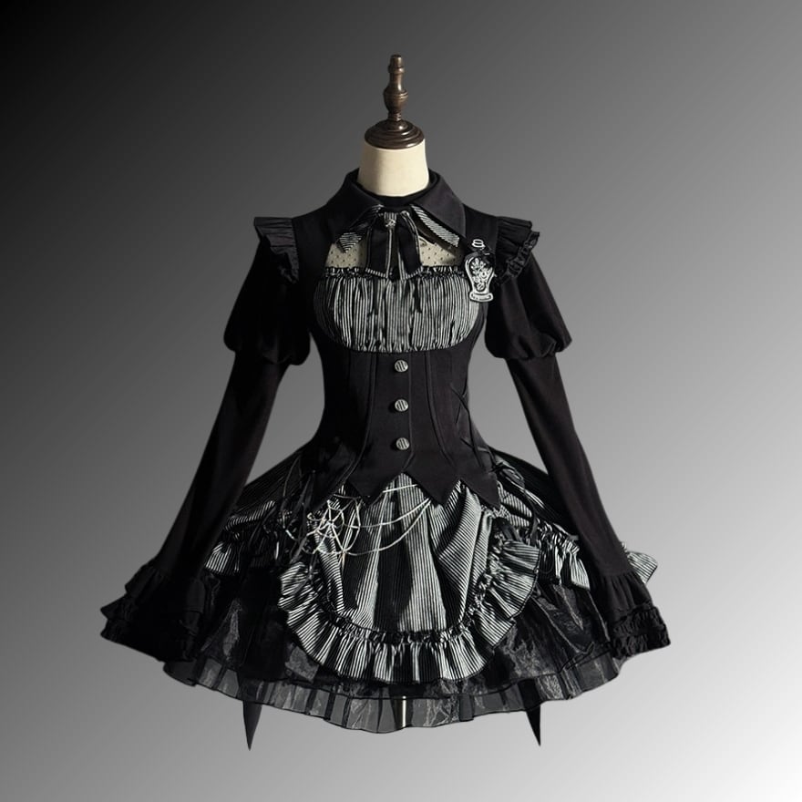前回のゴスロリドレスと同一世界観で設計された長袖デザイン。シアードット切替が映える、シリーズコーデ必須の一着です。
