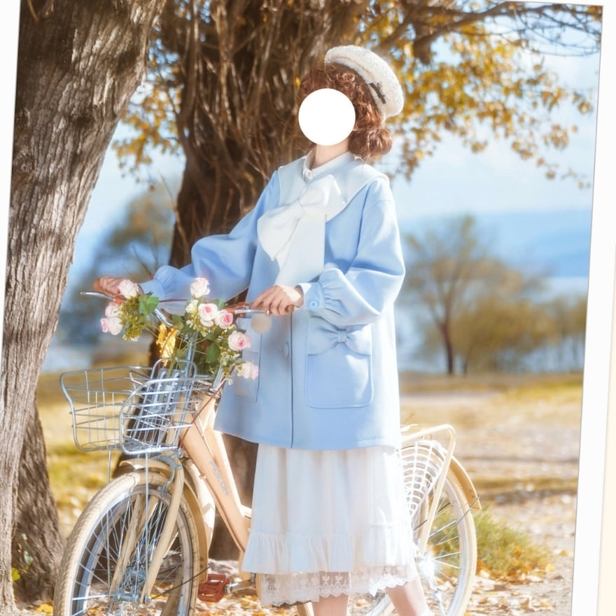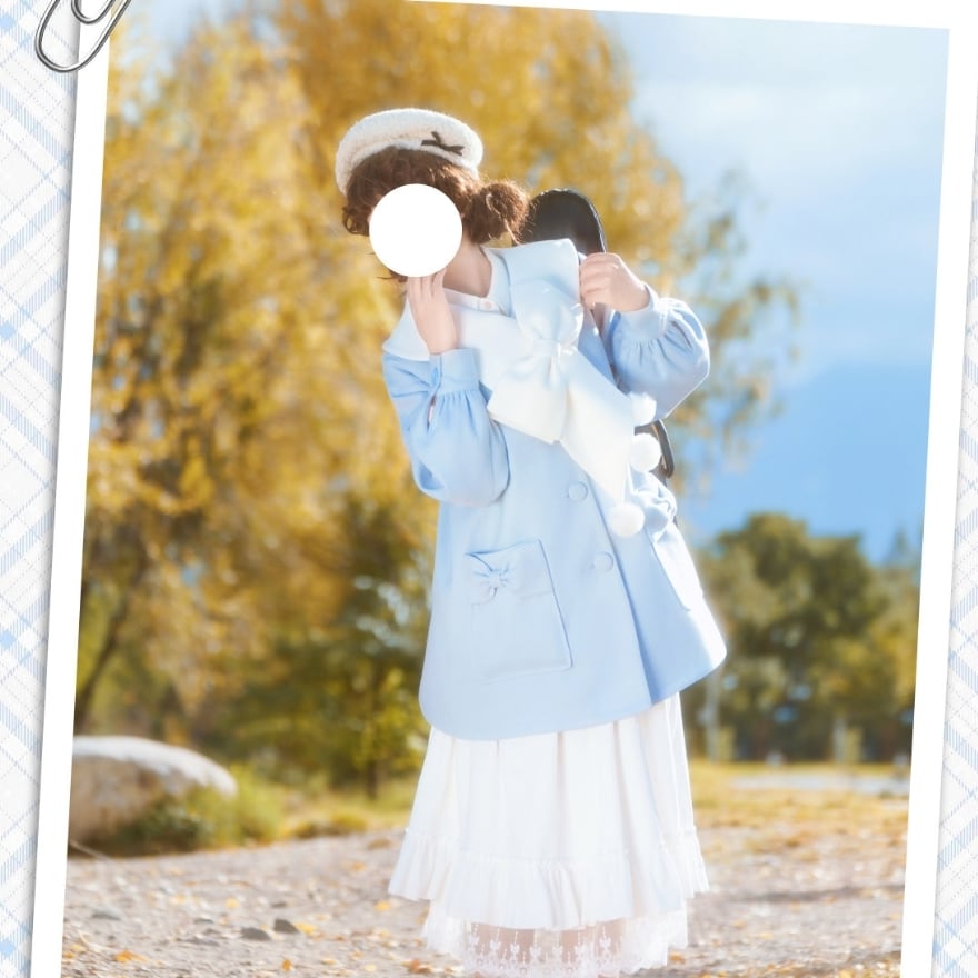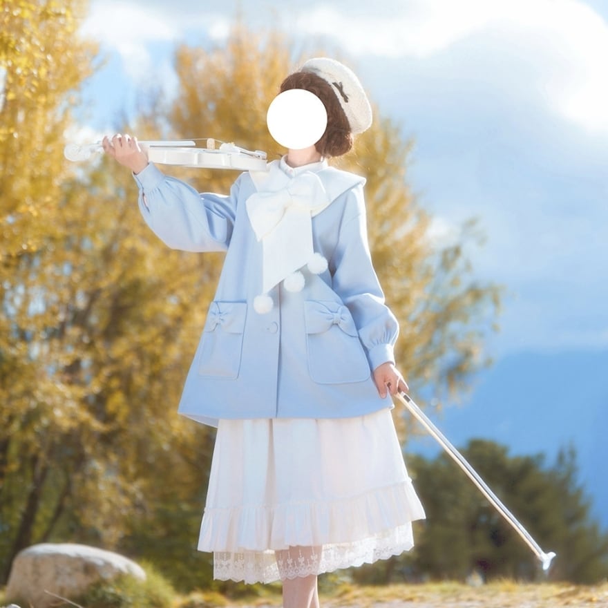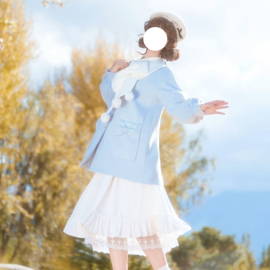 淡いカラーと大きなリボンが印象的な、甘ロリテイストのロリィタ向けコート。