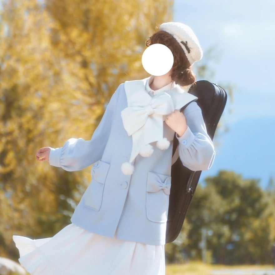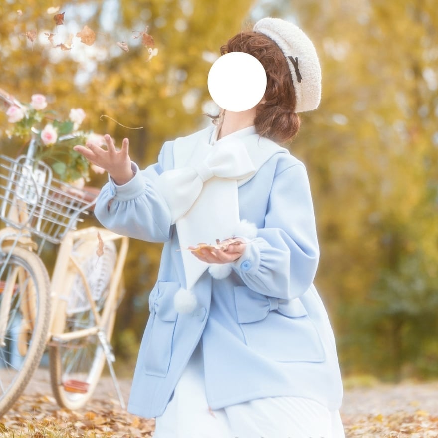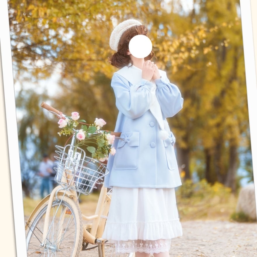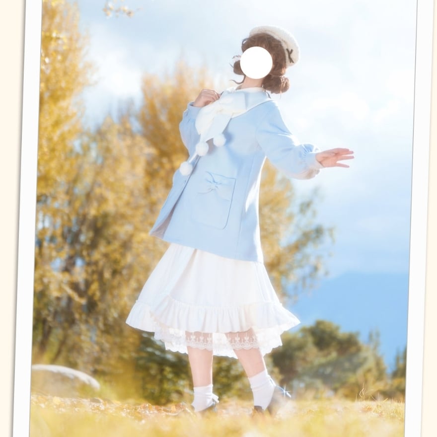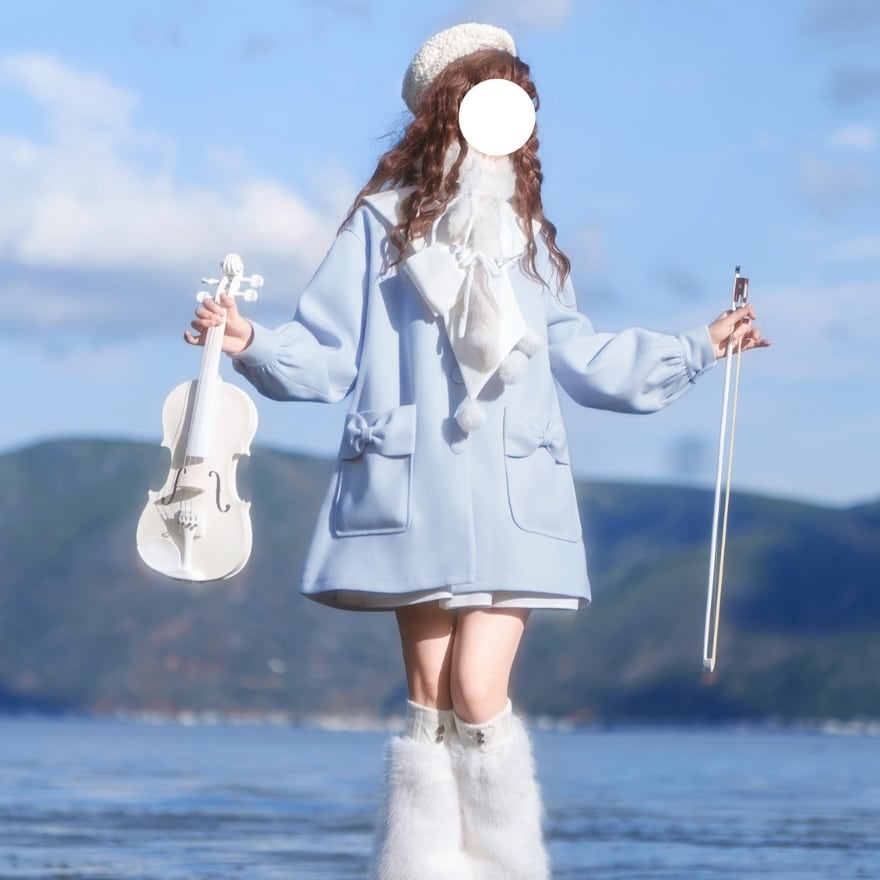 淡いカラーと大きなリボンが印象的な、甘ロリテイストのロリィタ向けコート。