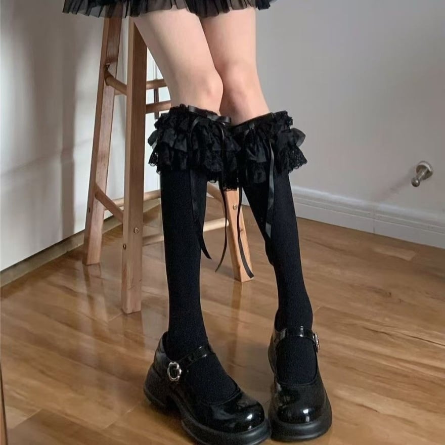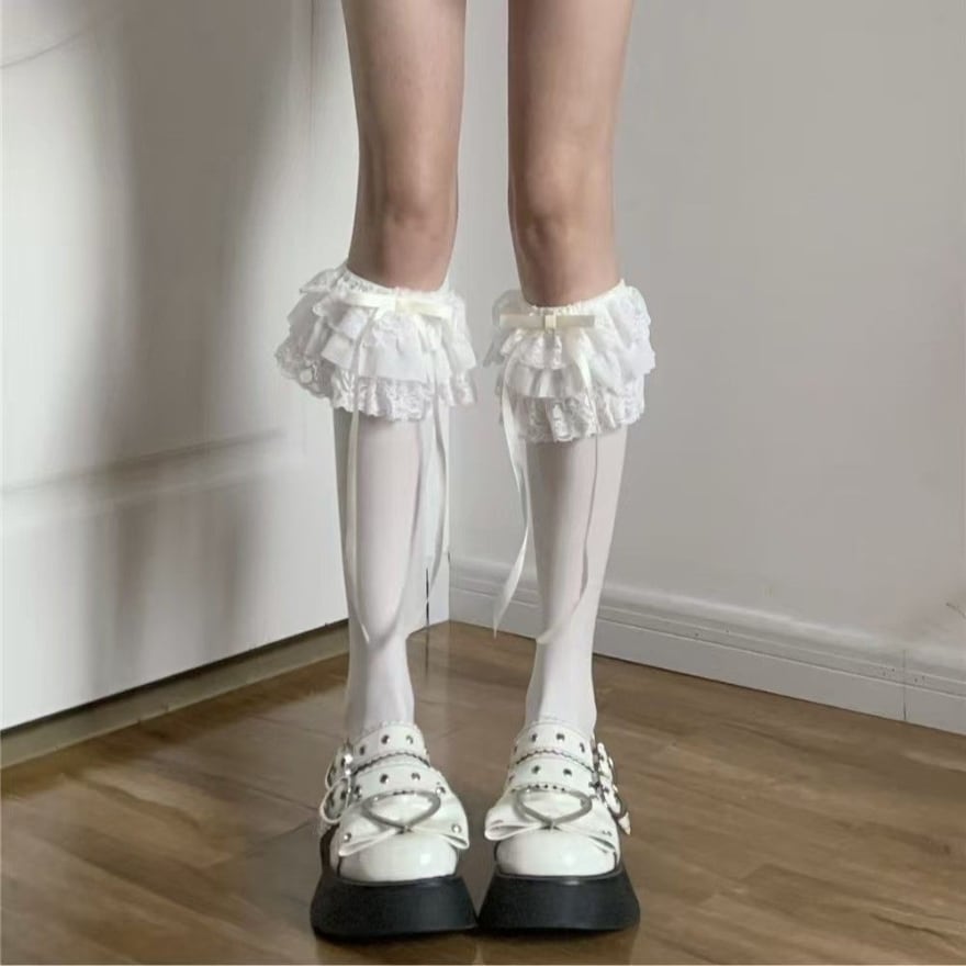 フリルレースとリボンが可憐なガーター風ロリィタソックス。