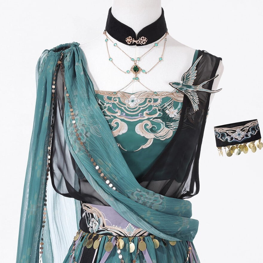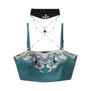 胸元には中華文様と孔雀モチーフの刺繍装飾をあしらい、