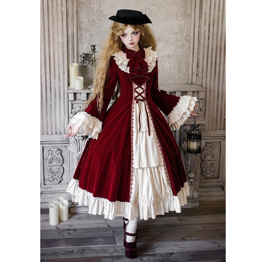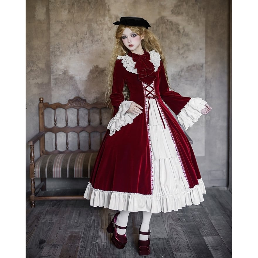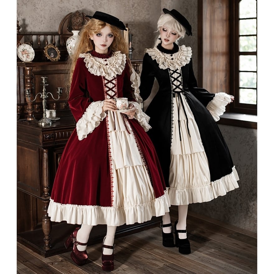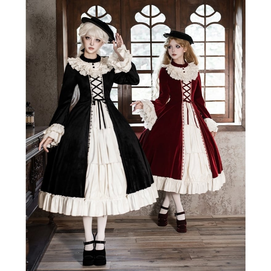 重厚感のあるベルベット調素材と、繊細なフリルが織りなす