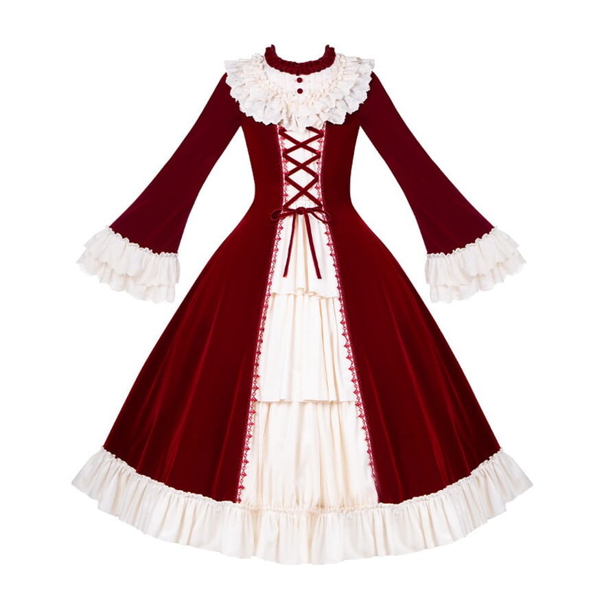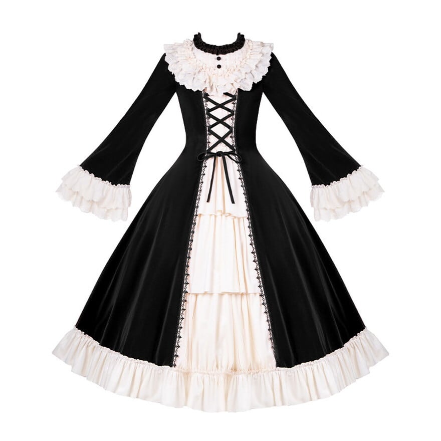 襟元は多層フリルの立ち襟デザイン。