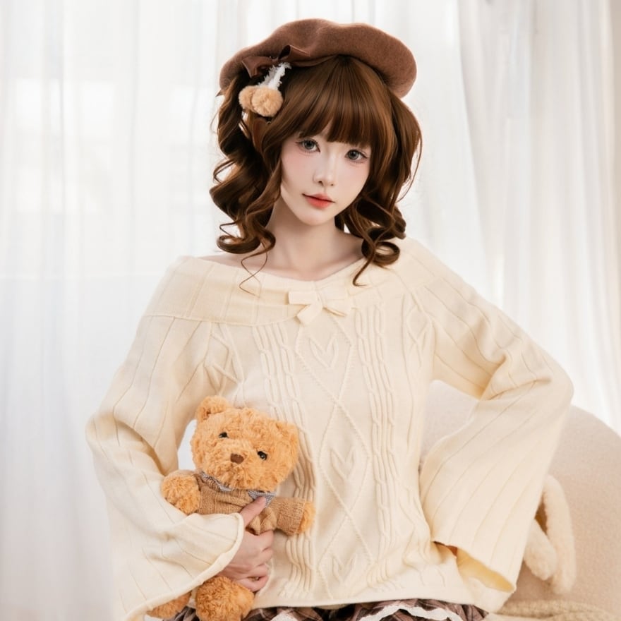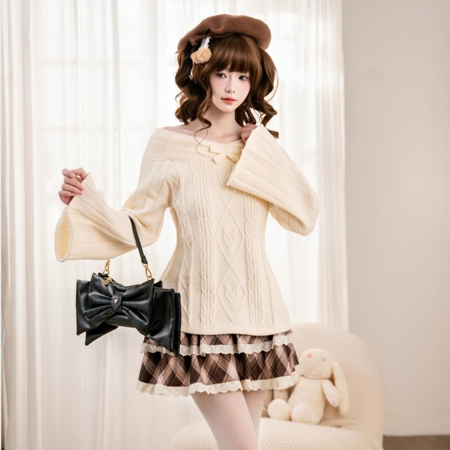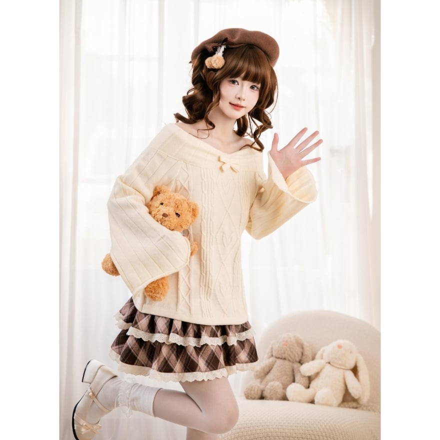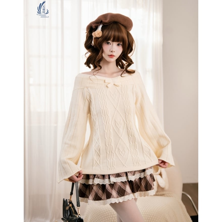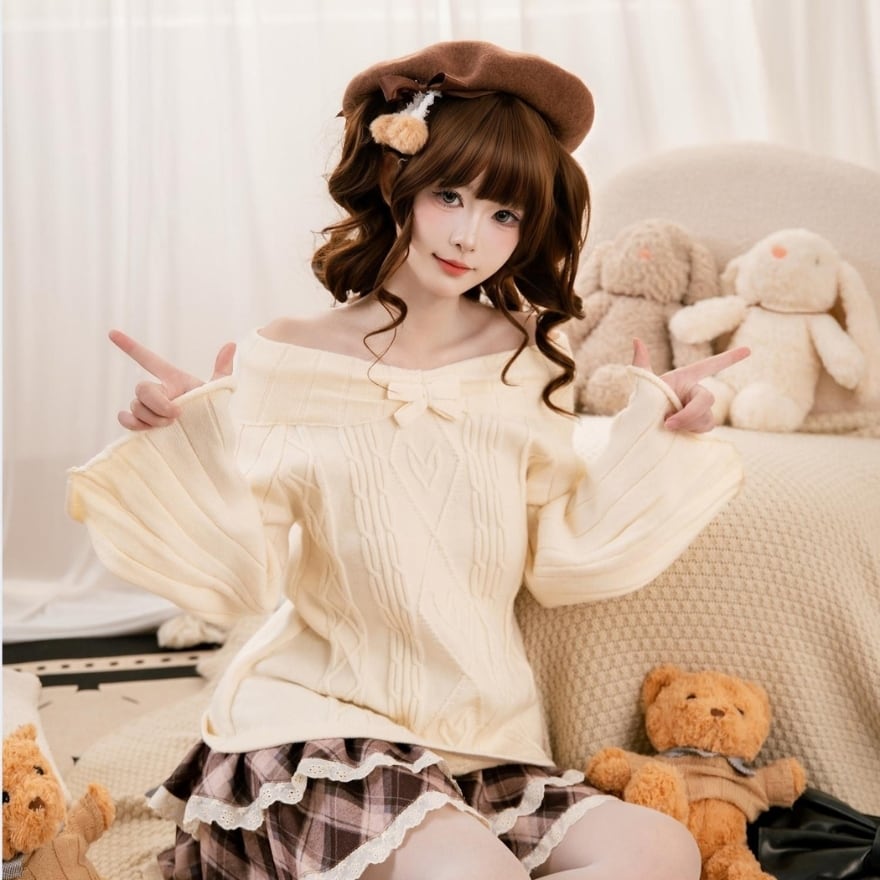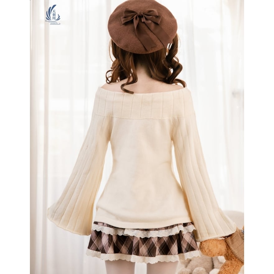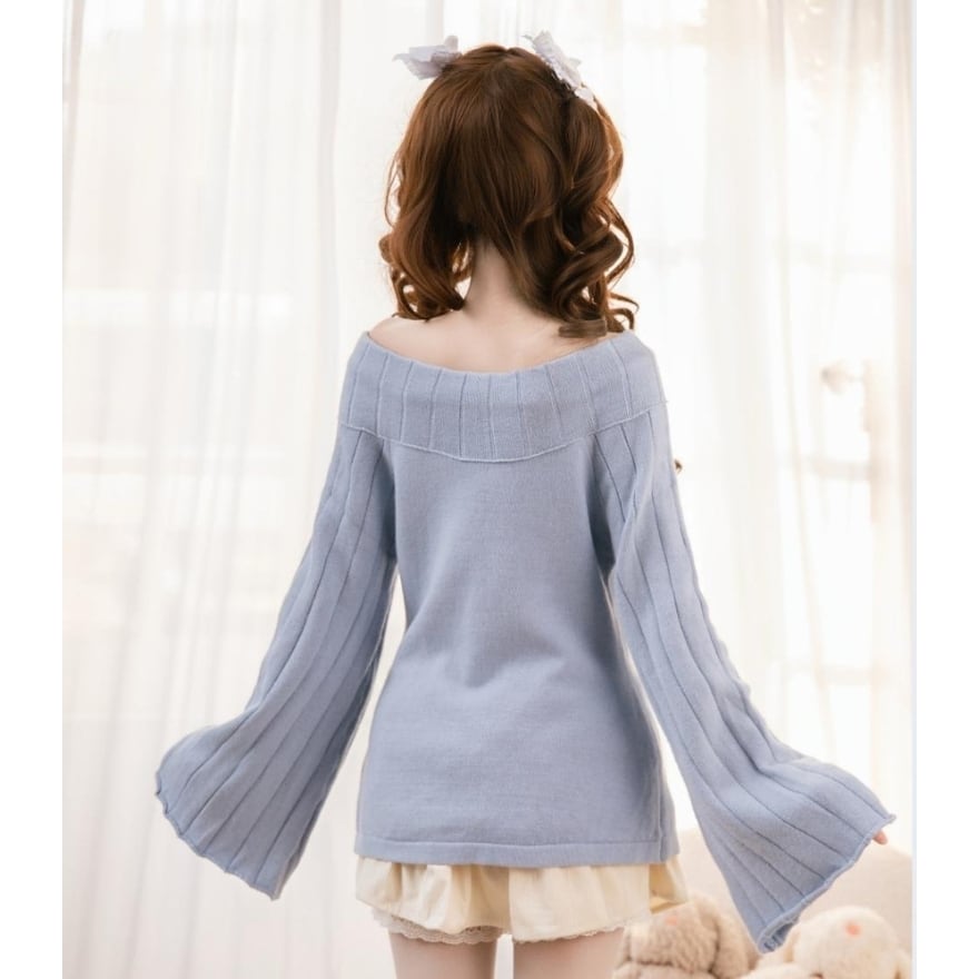 やわらかな雰囲気に包まれる、ロリィタテイストのガーリーなオフショルダーニットトップス。