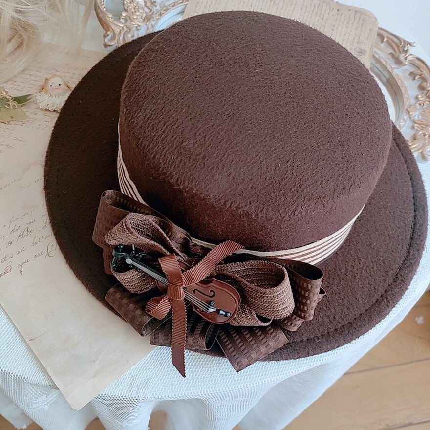 深みのあるブラウンの帽体に、繊細なヴァイオリンモチーフを贅沢にあしらいました。