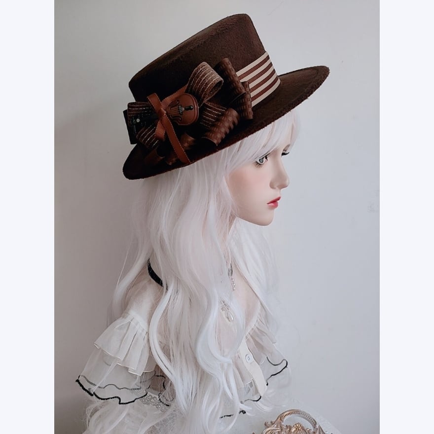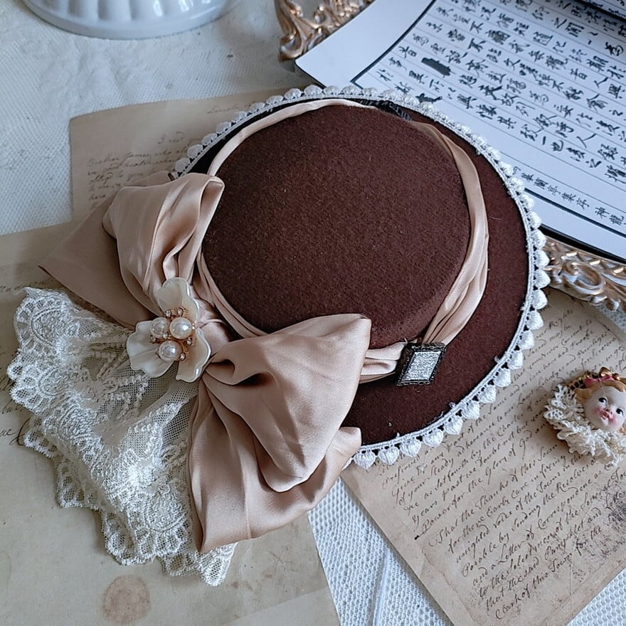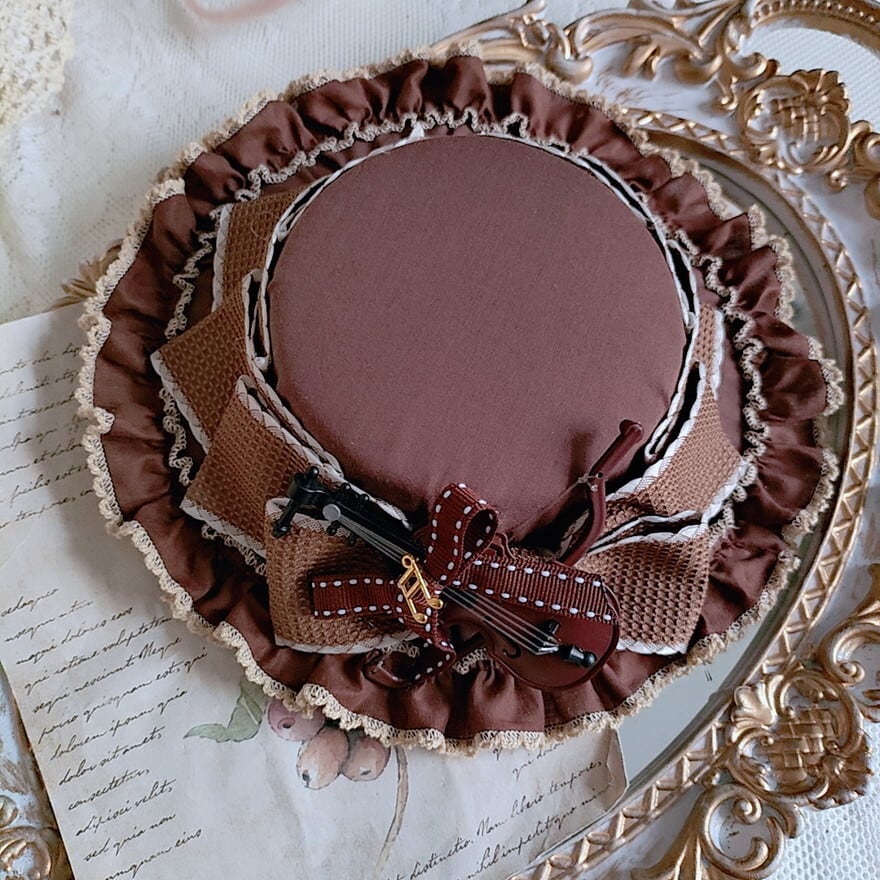 琥珀色に輝くヴァイオリンが、静かに物語を語り出すようなヘッドドレスです。深みのあるブラウンのリボンに、繊細な弦楽器のモチーフと贅沢なフリルレースを添えて、気品あふれるアンティークな佇まいに仕上げました。被るだけで、クラシックの音色を纏うような優雅なひとときを演出し、貴女を特別な演奏会の主役へと導きます。
