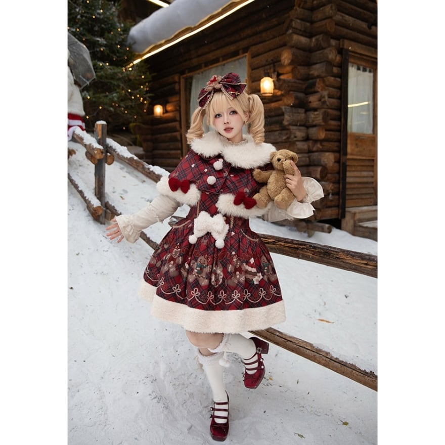 っ赤なタータンチェックに、雪のように白いファーを贅沢にあしらった、冬のヒロインのためのケープです。