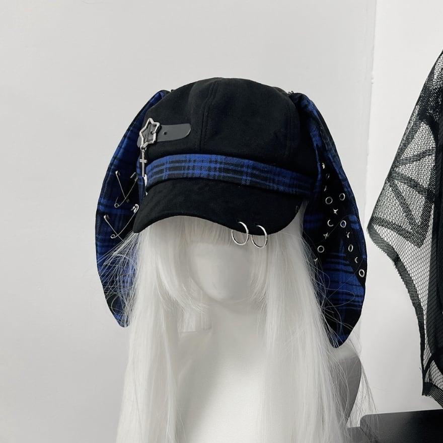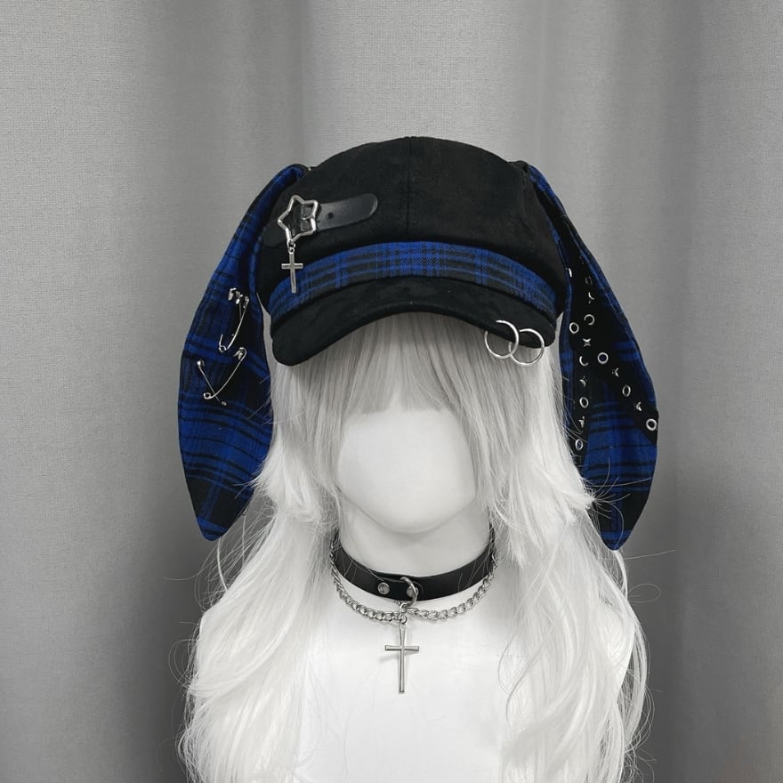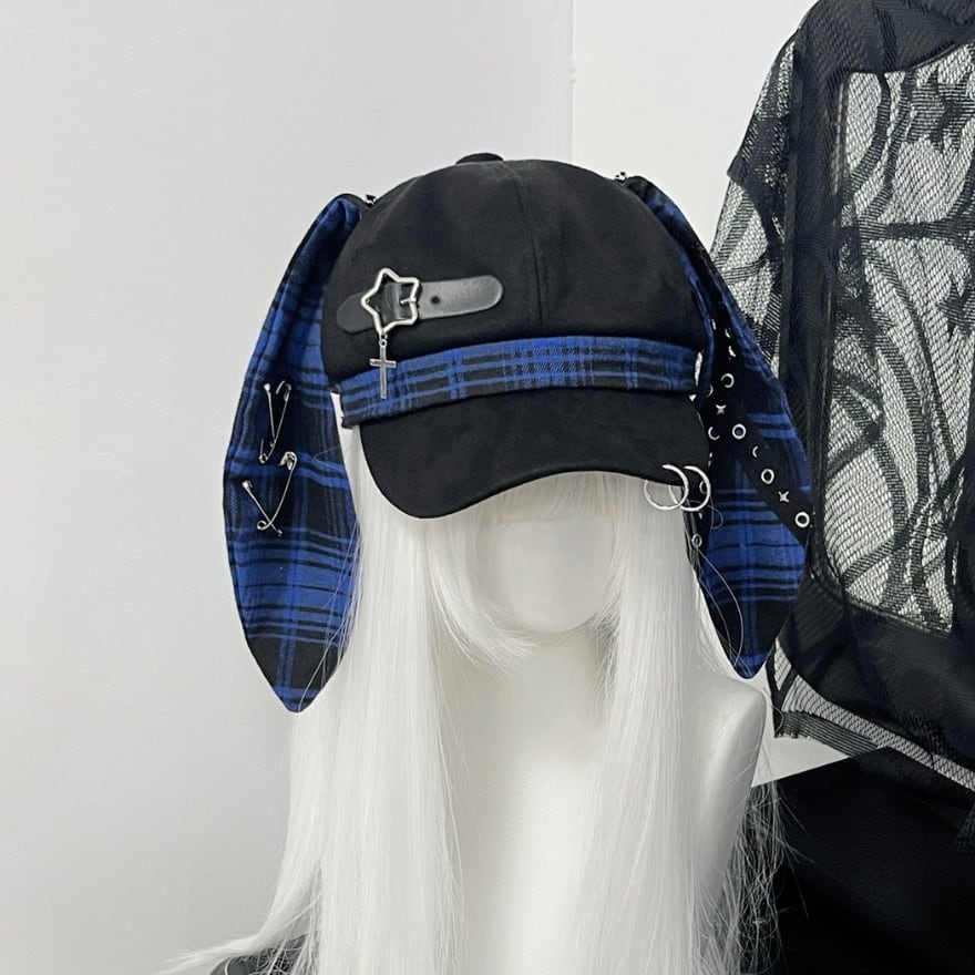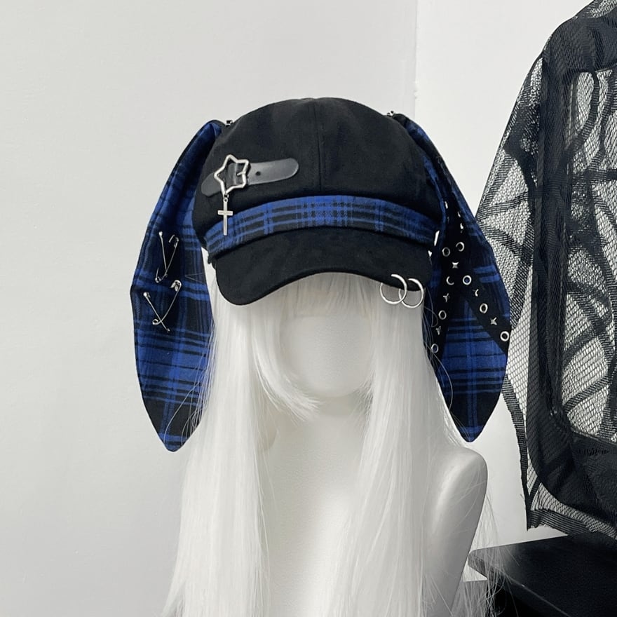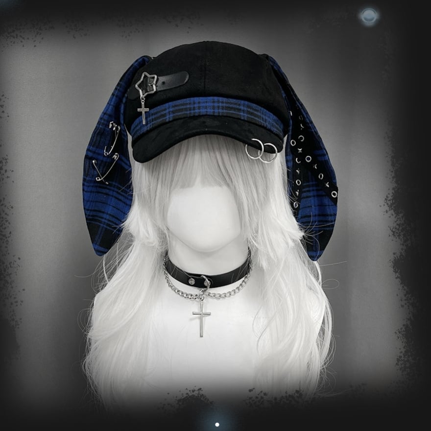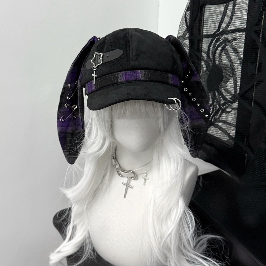 深淵のロップイヤー|安全ピン&十字架チャーム付ウサ耳キャスケット 地雷系パンク帽子
