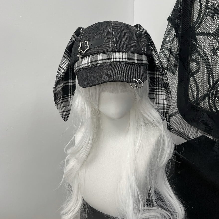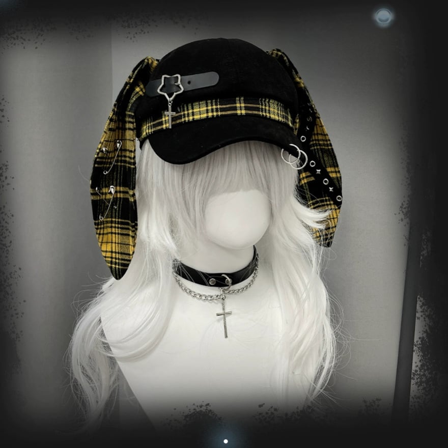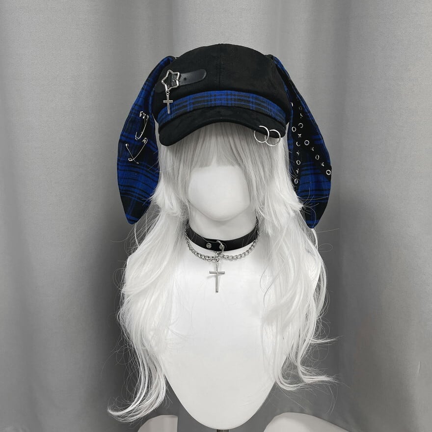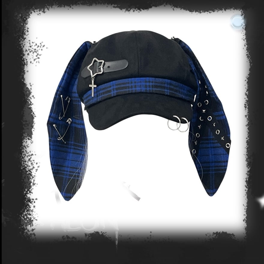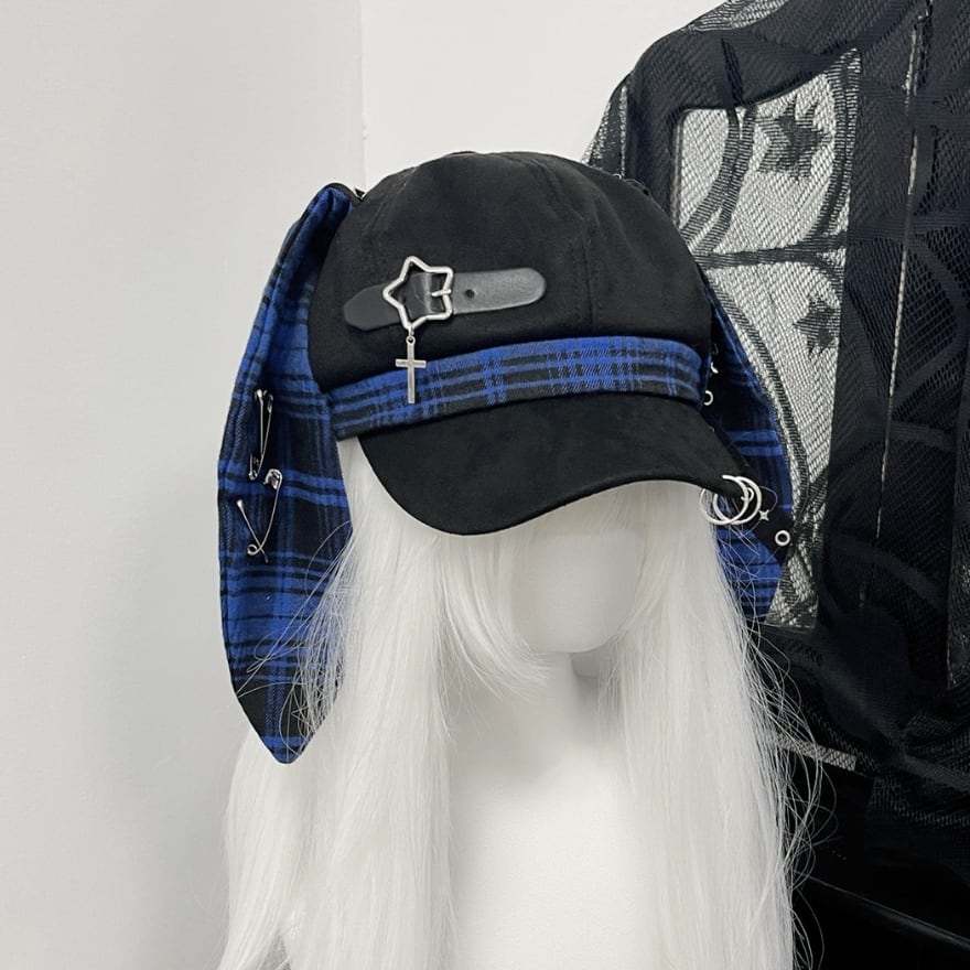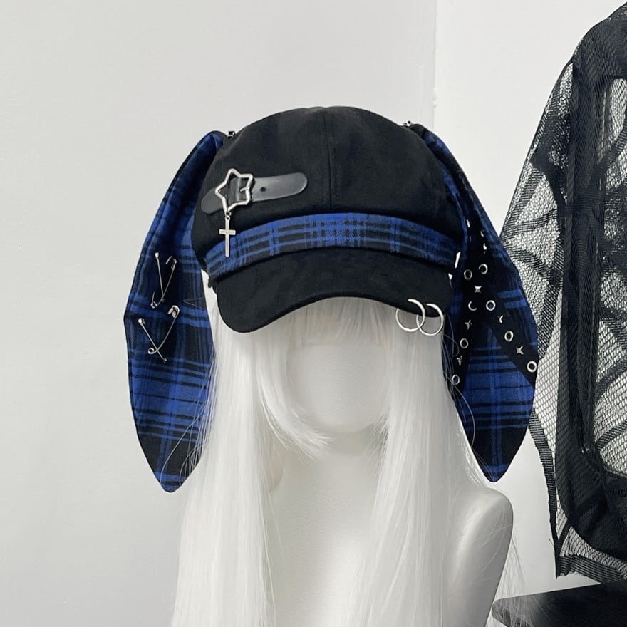 深淵のロップイヤー|安全ピン&十字架チャーム付ウサ耳キャスケット 地雷系パンク帽子