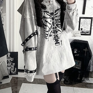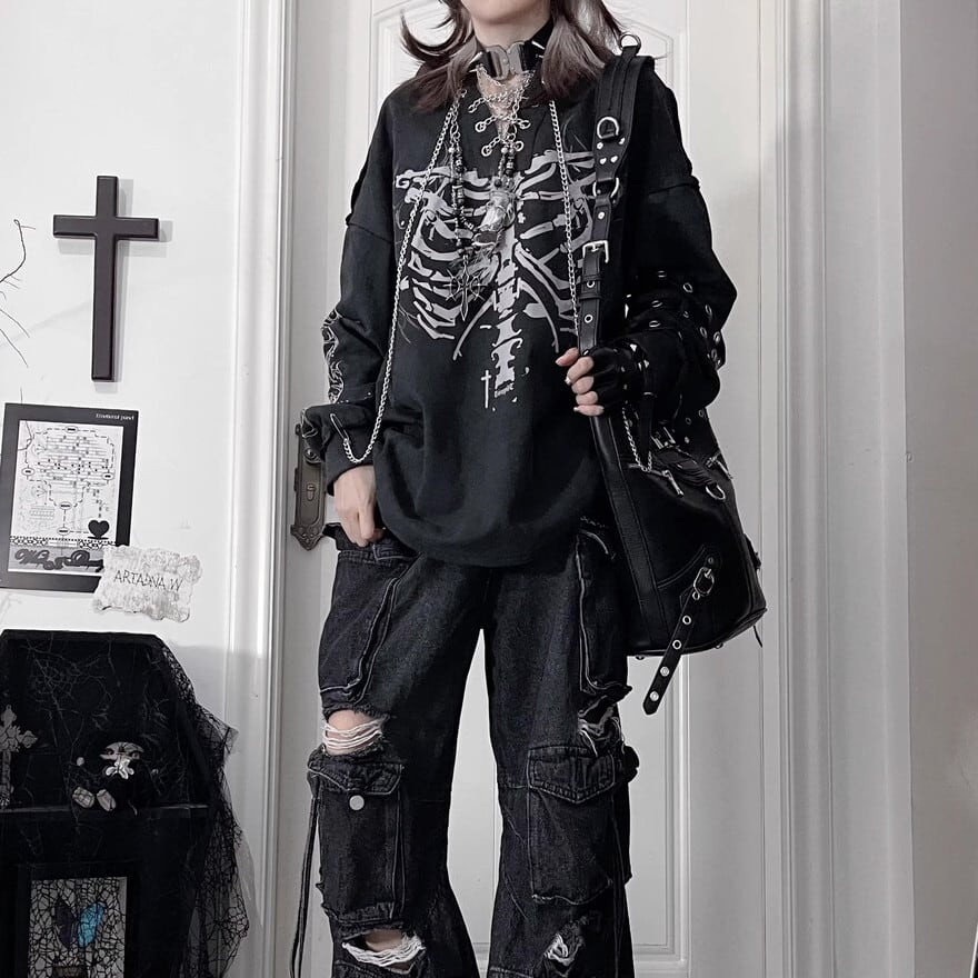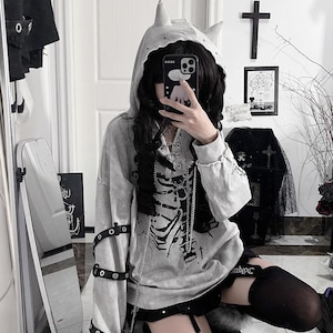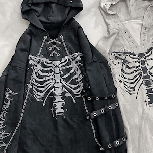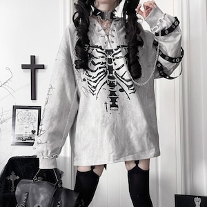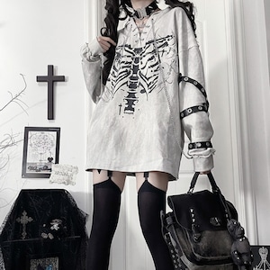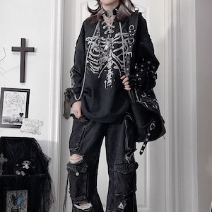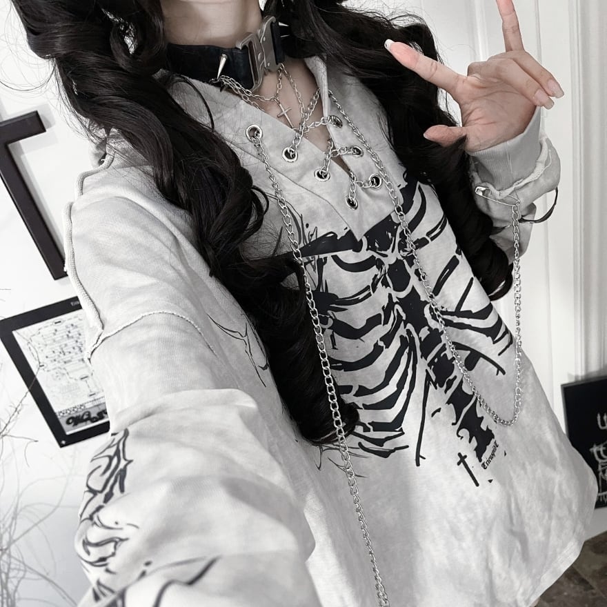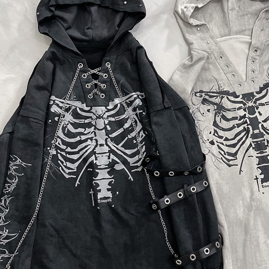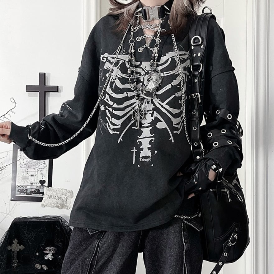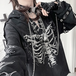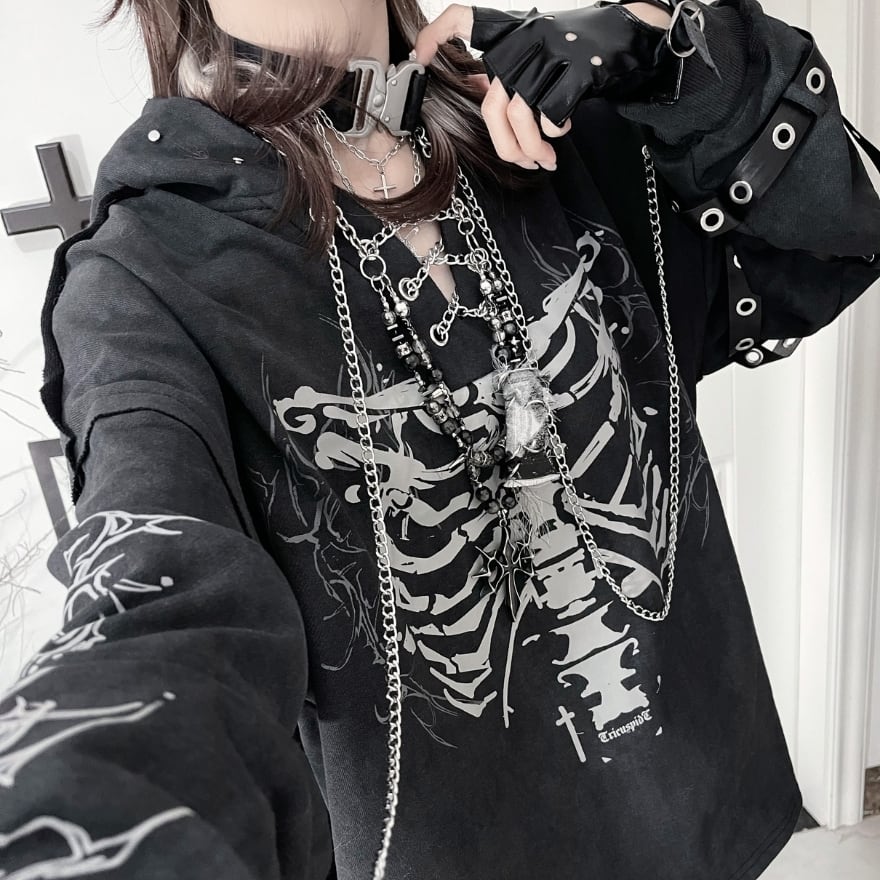 胸元に鎮座する重厚なボーンプリントが目を引く、ダークストリートの真髄をゆくフーディーです。小悪魔的なツノ付きフードや、袖に配された無骨なアイレットベルト、そして揺れるメタルチェーンが、大人のゴシックパンクスタイルに圧倒的な深みを与えます。一着でレイヤード風の完成された退廃美を楽しめる、至極の主役級アイテムです。