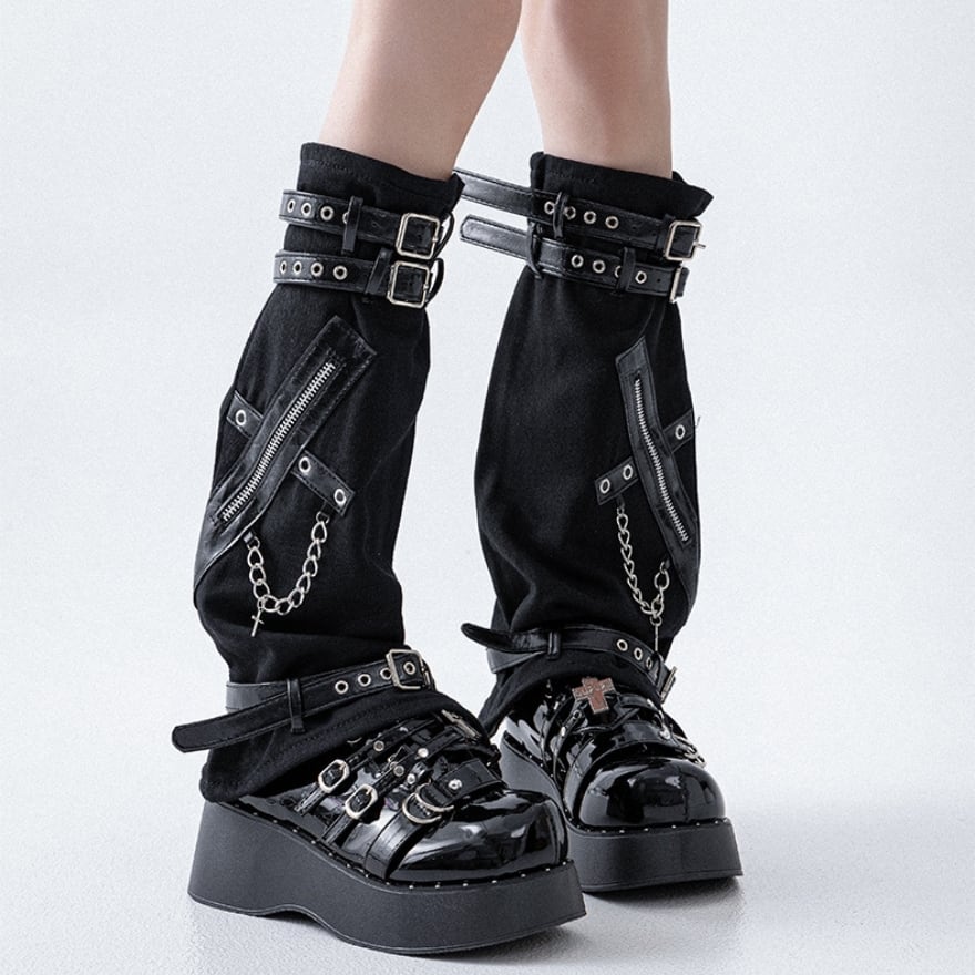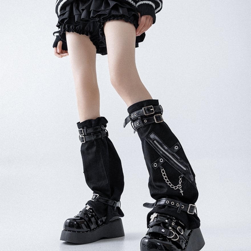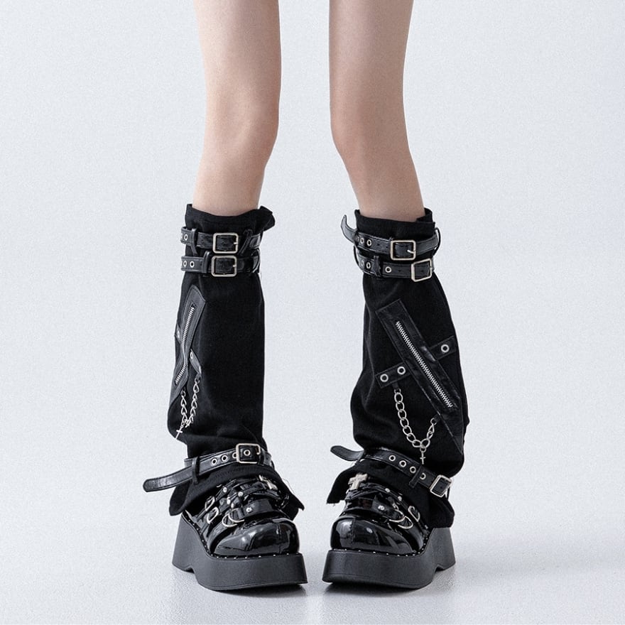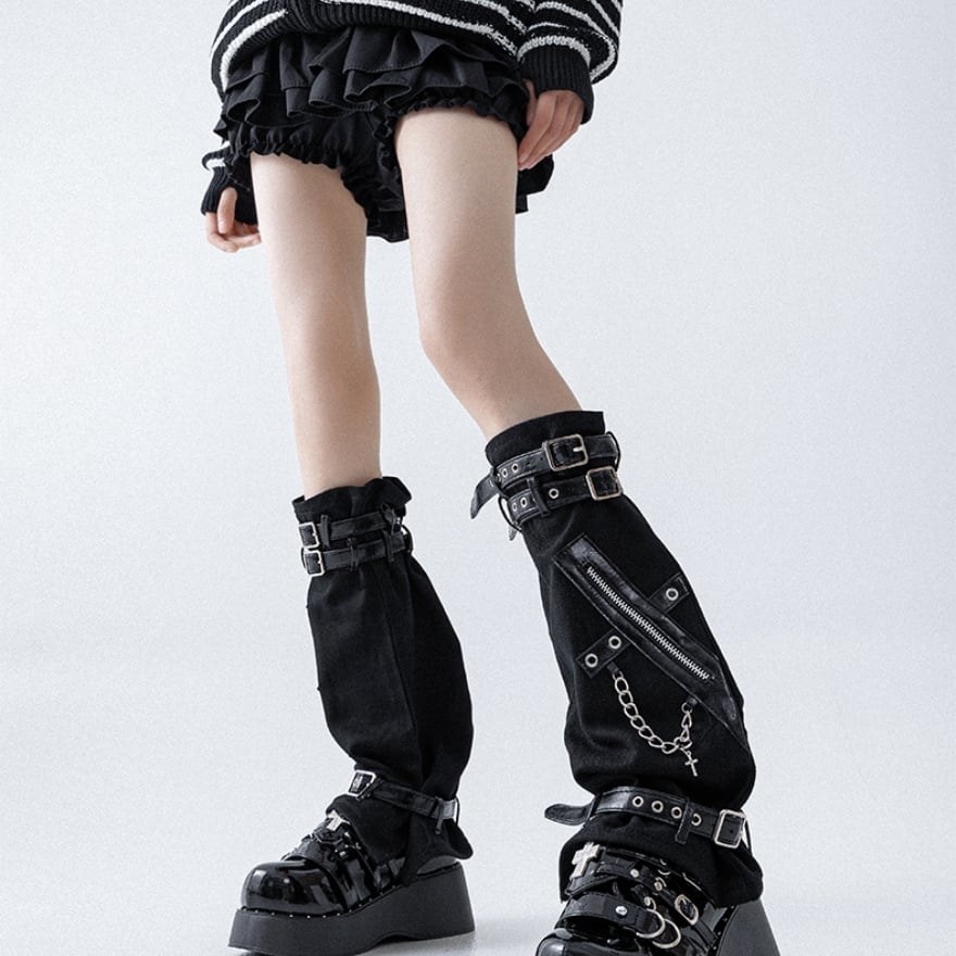 鉄鎖の境界線レッグウォーマー|多重バックルベルト&メタルチェーン付 ジッパー装飾