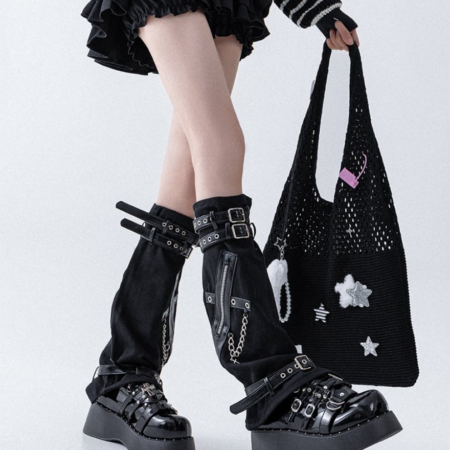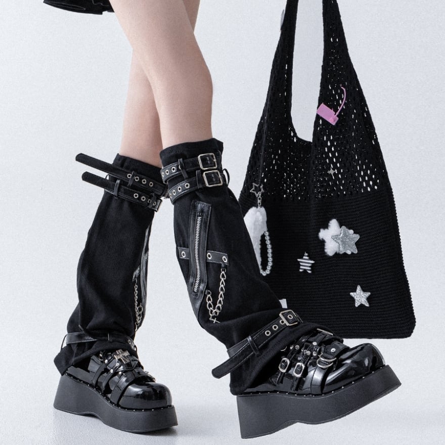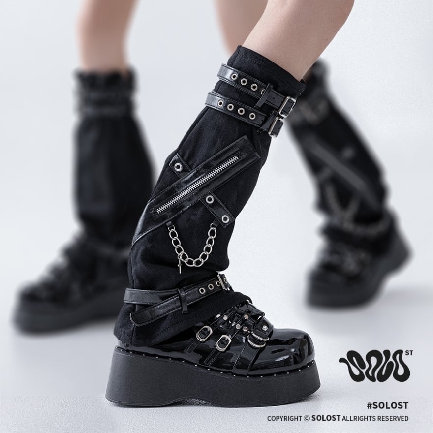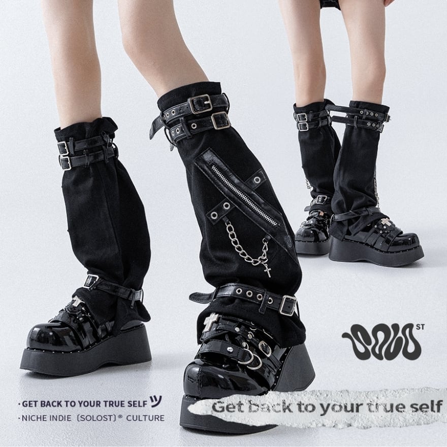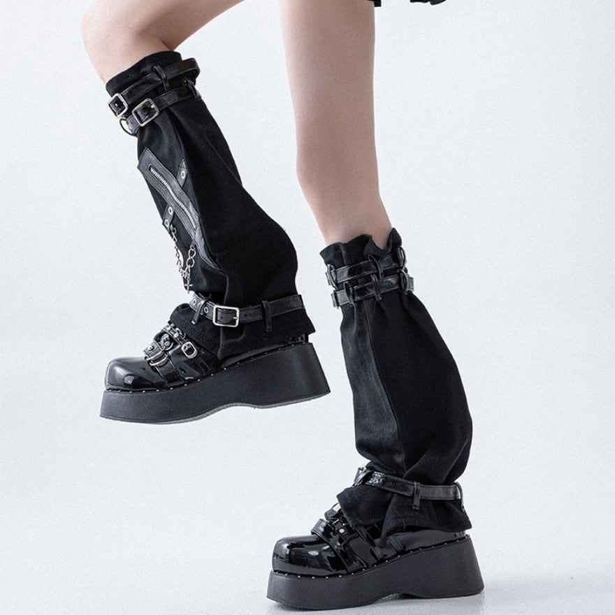 鉄鎖の境界線レッグウォーマー|多重バックルベルト&メタルチェーン付 ジッパー装飾