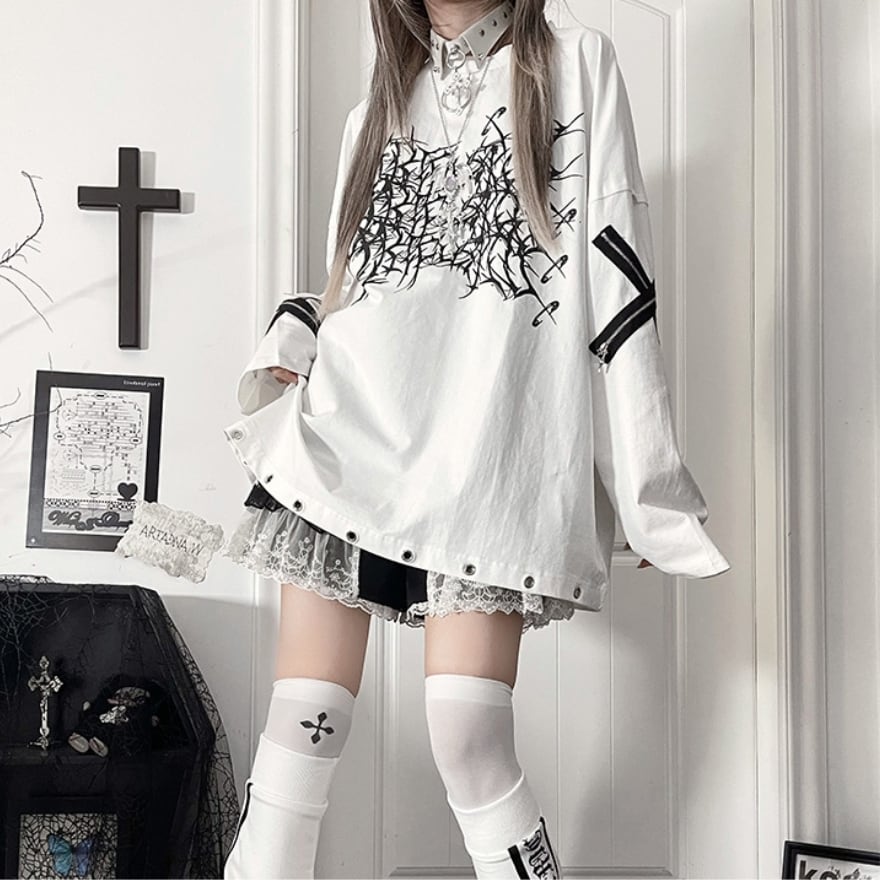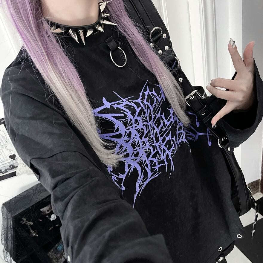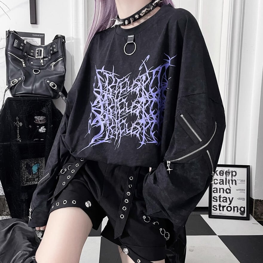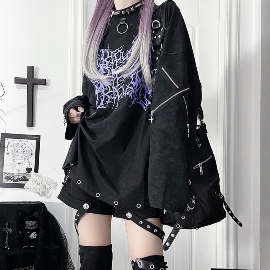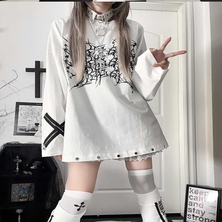 棘状茨の断罪グラフィック・ジッパー装飾オーバーサイズ長袖カットソー(ブラック/ホワイト/パープル)