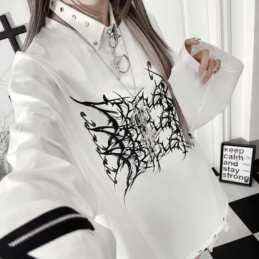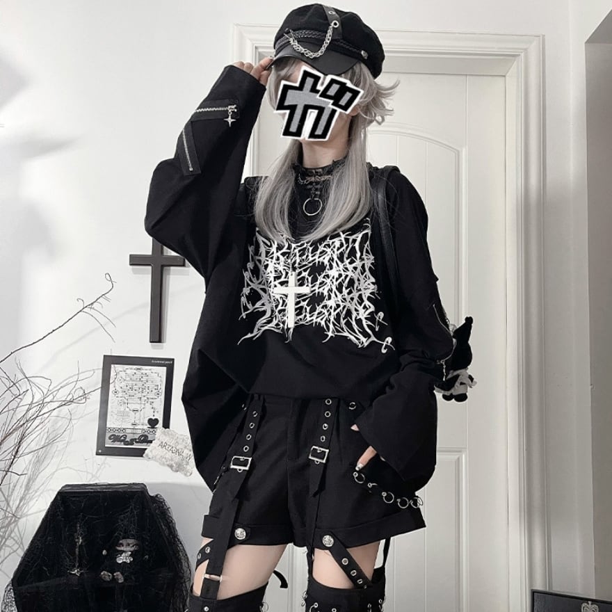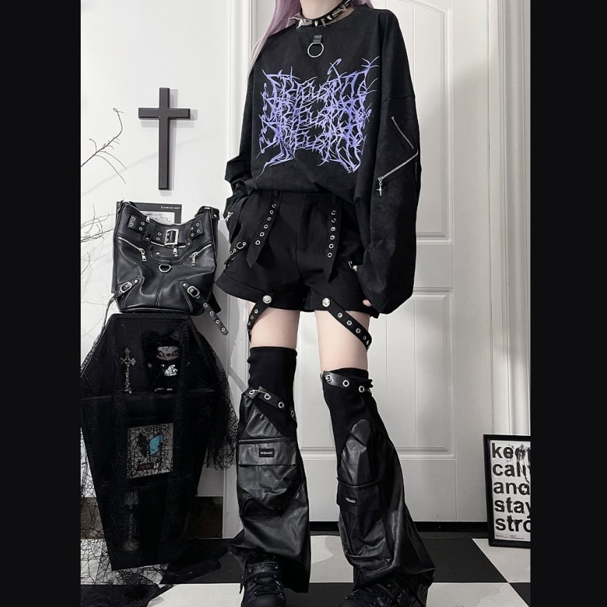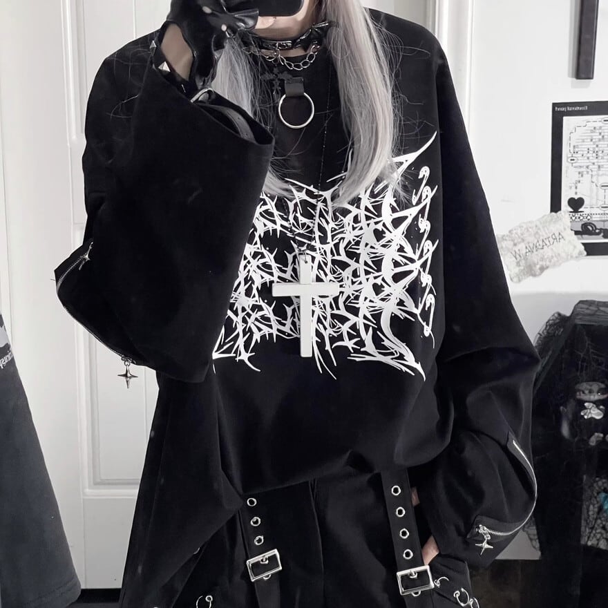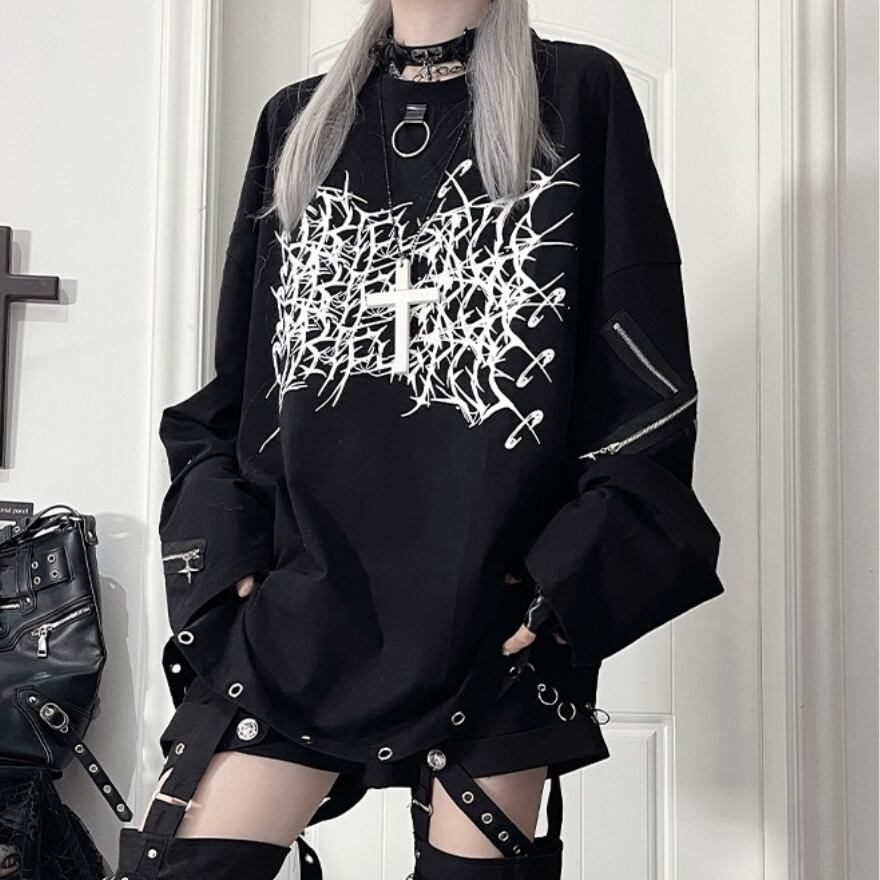 棘状茨の断罪グラフィック・ジッパー装飾オーバーサイズ長袖カットソー(ブラック/ホワイト/パープル)