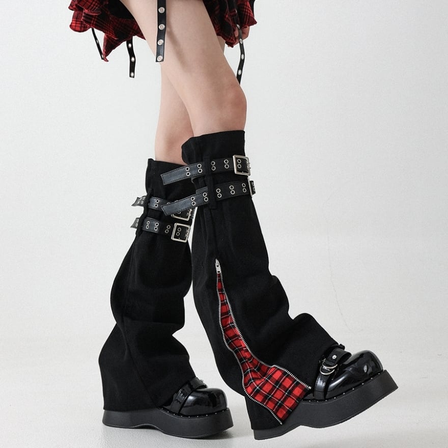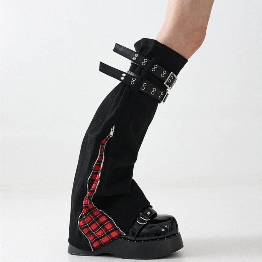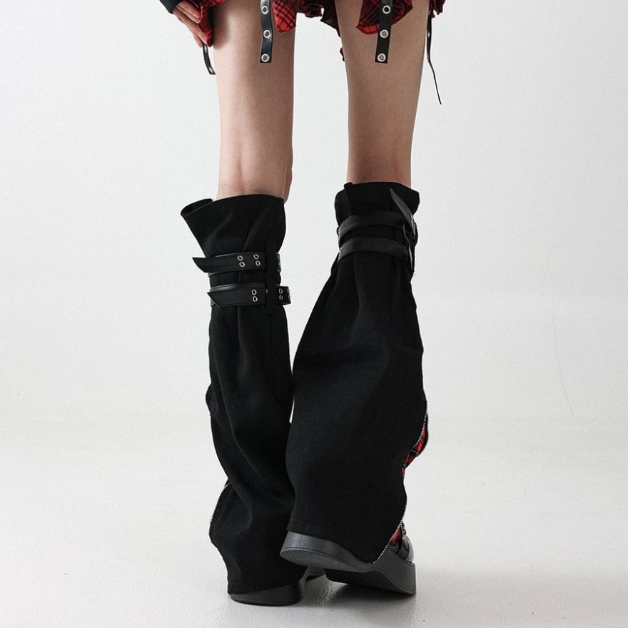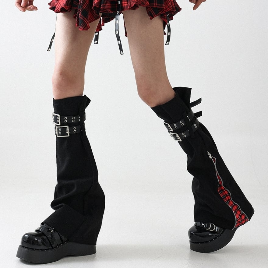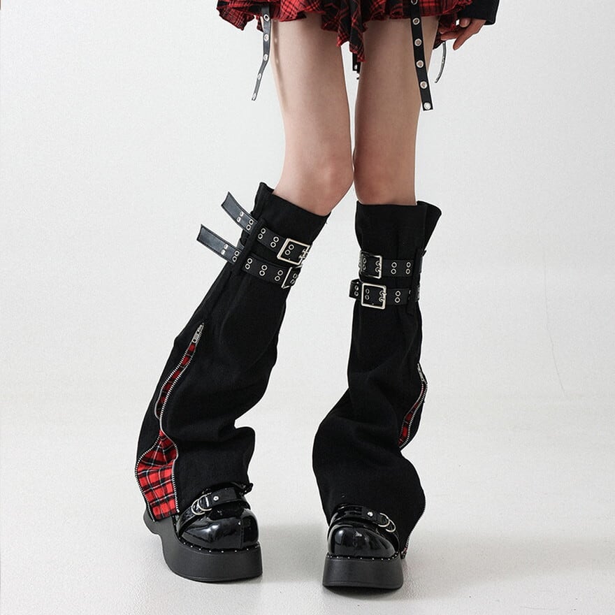 タータンチェックジップ・ダブルバックル付カバーレッグウォーマー ブラック×レッド
