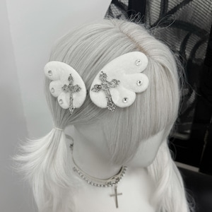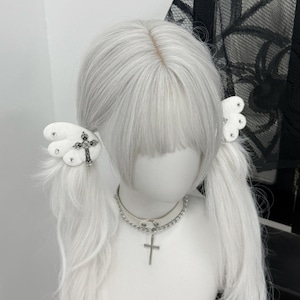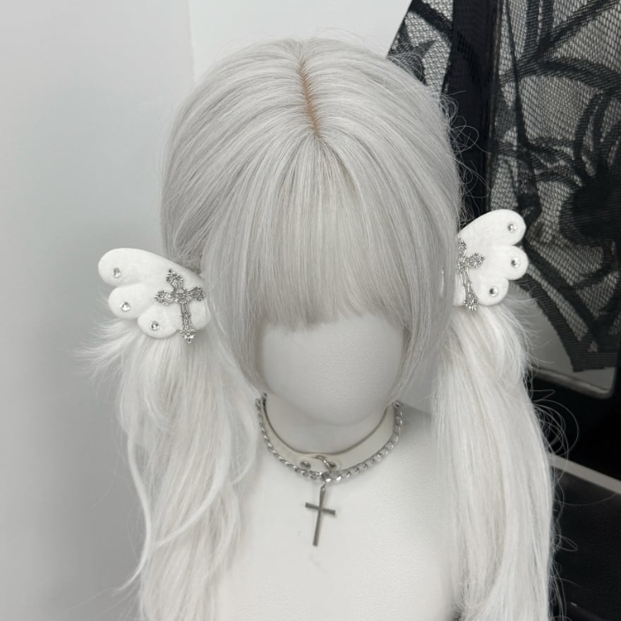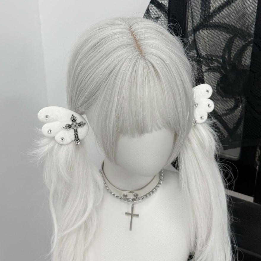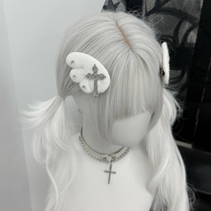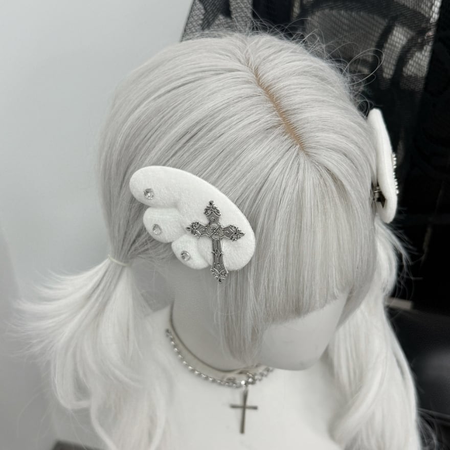 ふんわりとした純白の羽に、重厚感のある十字架と煌めくビジューを配したヘアクリップです。天使界隈や地雷系ファッションのアクセントに最適で、ツインテールやサイド留めなど自在なアレンジが可能。儚さと毒っ気が共存する独創的なデザインが、あなたの「病み可愛い」を完成させます。サブカルコーデの仕上げに。