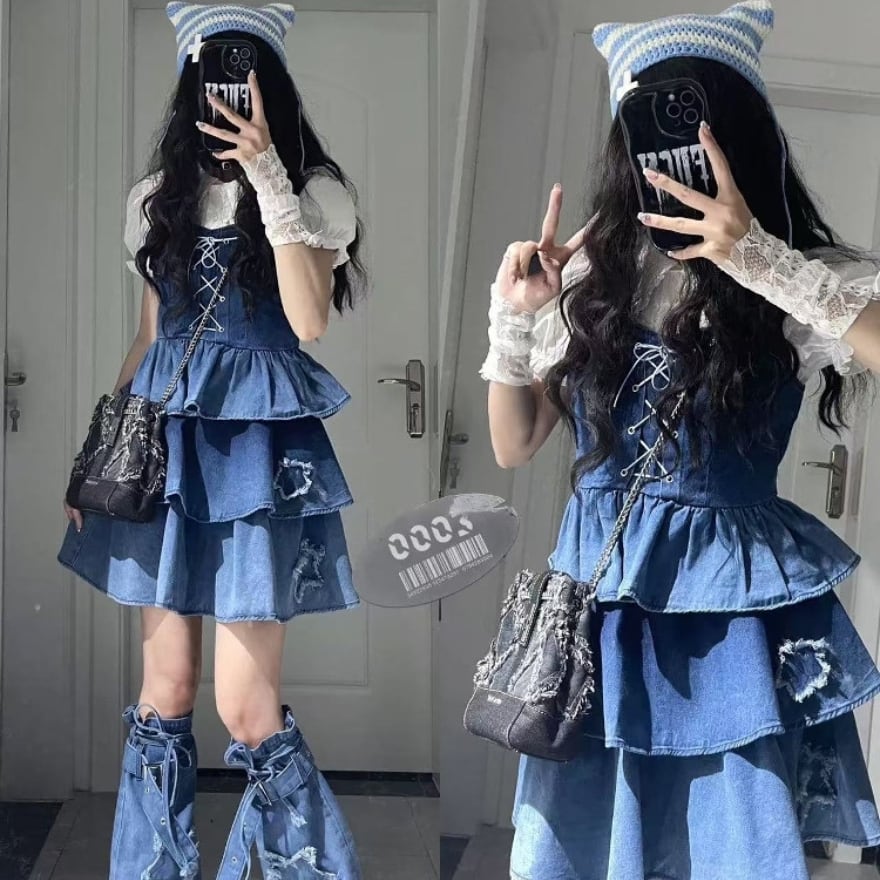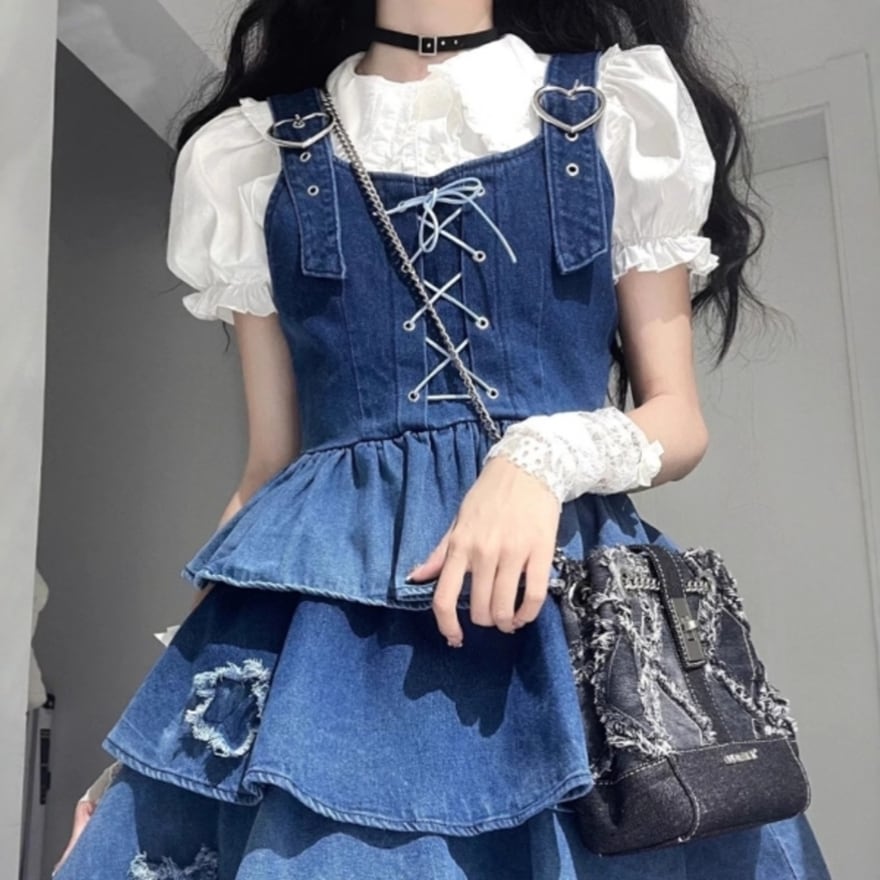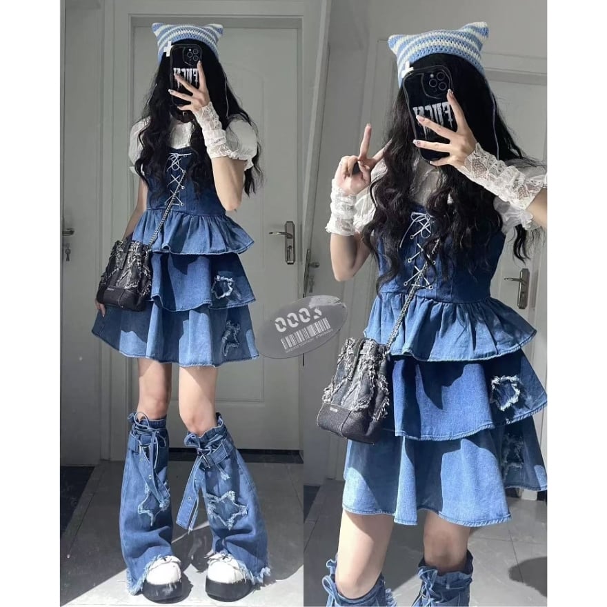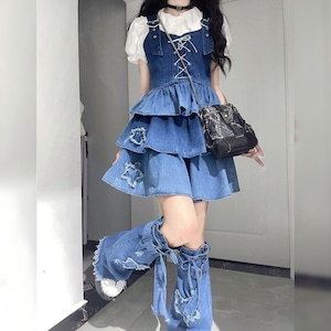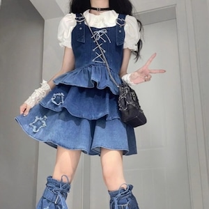 星屑ダメージが映える|Y2K×地雷系デニムフリルジャンパースカートセットアップ ライブや推し活におすすめ