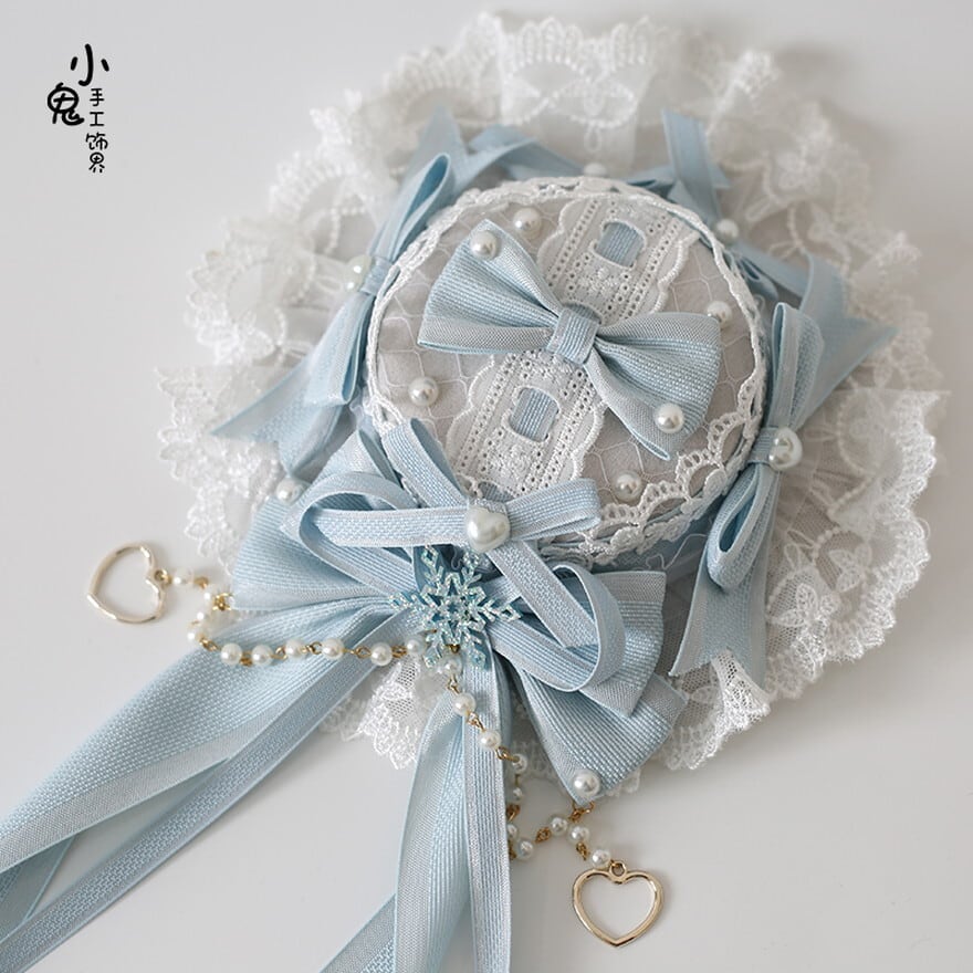 中央には輝く雪の結晶やリボンの装飾をあしらい、冬の装いやお茶会にぴったりの特別感を演出します。