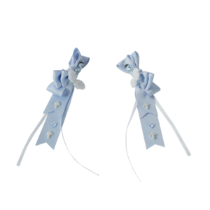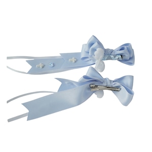 光沢のある水色サテンリボンに、透明な注射器と繊細な十字架をデコレーション。