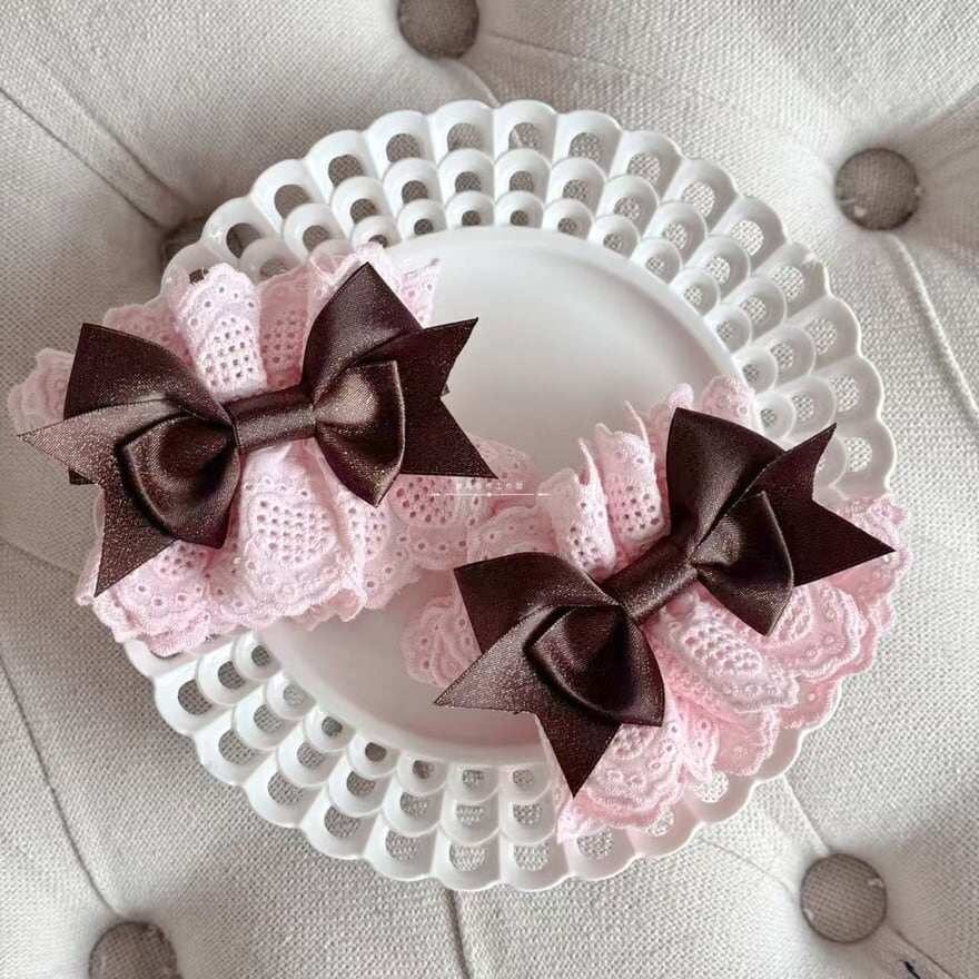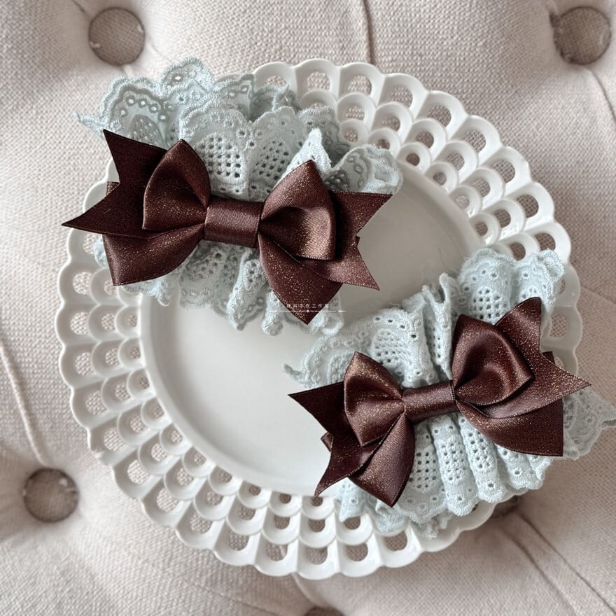 深みのあるショコラブラウンのリボンに、繊細なフリルレースを贅沢に重ねたヘアクリップ2個セットです。