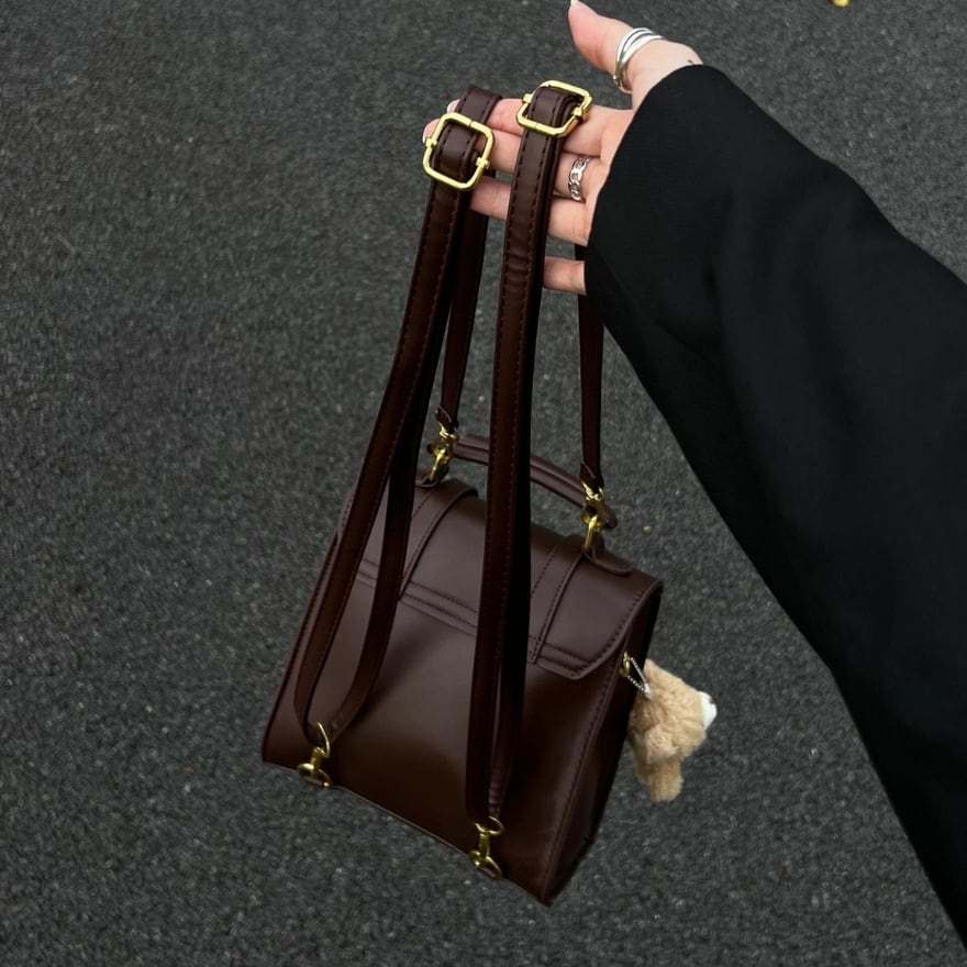愛らしいくまのぬいぐるみチャームがセットで、背面のストラップを付け替えることでリュック、ショルダー、ハンドバッグとして使える便利な3WAY仕様。