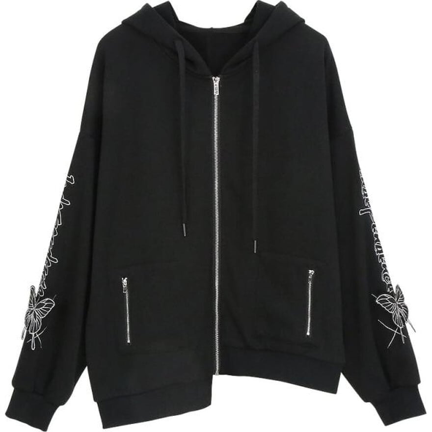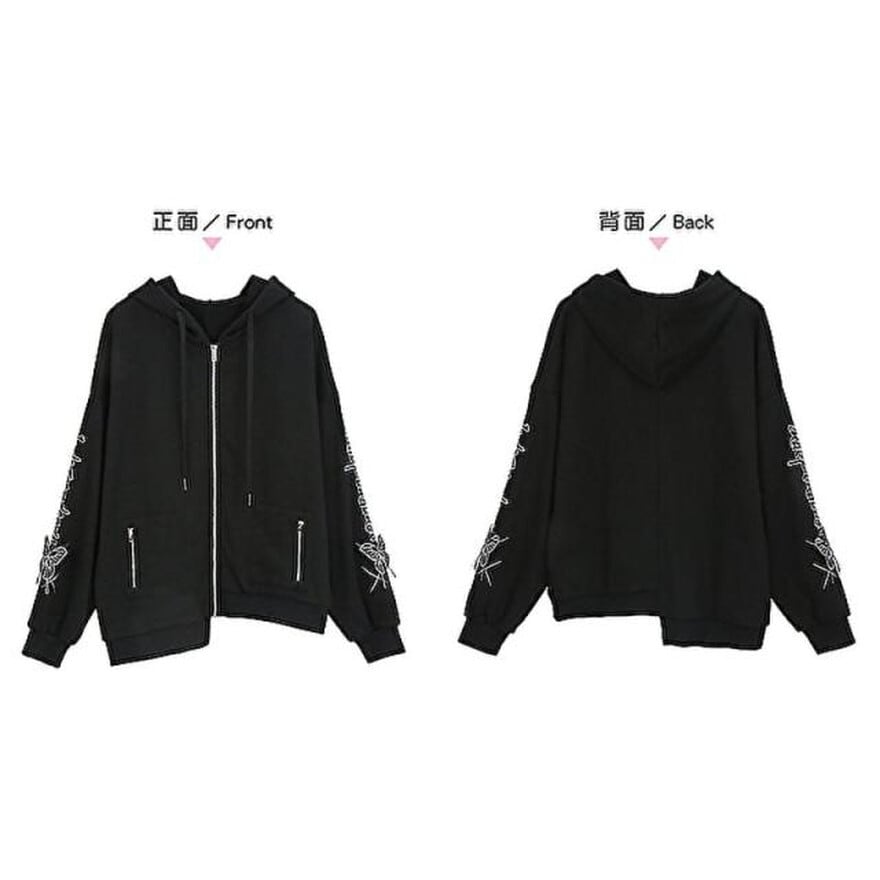 蝶刺繍パーカー ストリート|黒 フード付き ジップアップ オーバーサイズ 地雷系 病み系 英字ロゴ バタフライ ゴシック