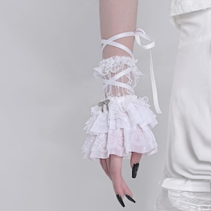 繊細な総レースと贅沢なボリュームフリルを組み合わせた、フェミニンなアームウォーマーです。