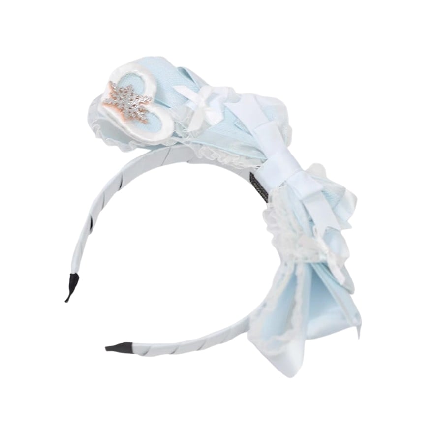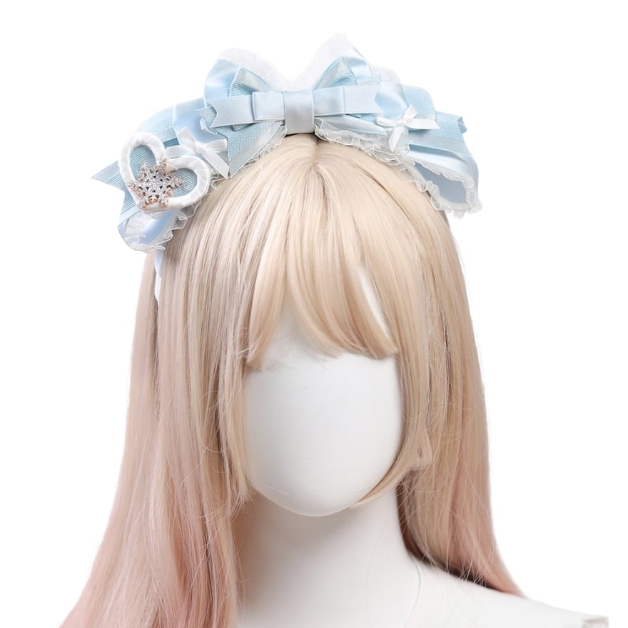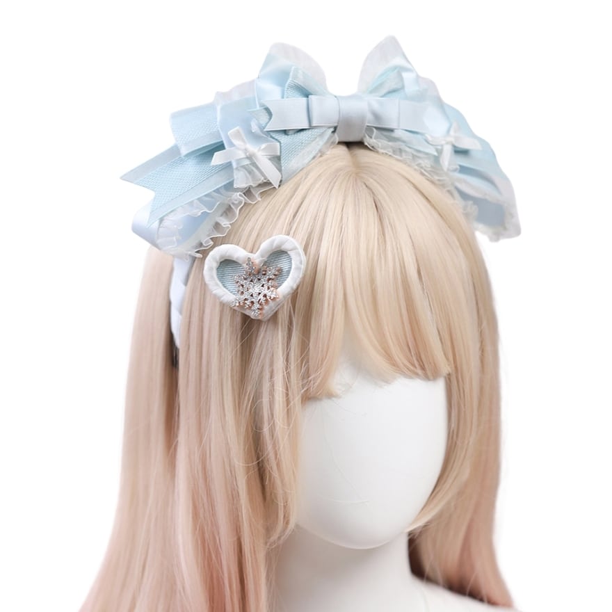 アイスブルーのリボンに、雪の結晶モチーフをあしらったウィンターロリィタヘアクリップ2点セット。