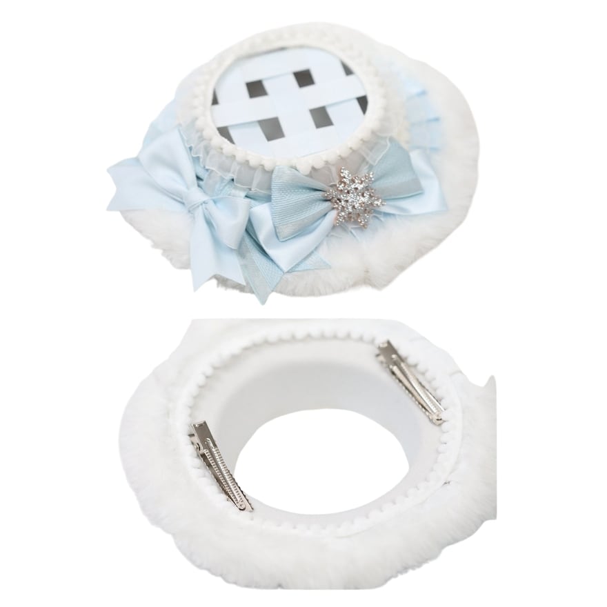 アイスブルーを基調に、ファーとリボン、雪の結晶モチーフをあしらったウィンターロリィタ小帽子。
