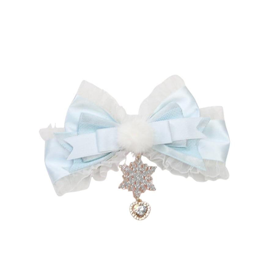 ・サテンリボンと雪の結晶: 艶やかなリボンとキラキラ輝くチャームが、上品で知的な「大人可愛い」透明感をプラスします。