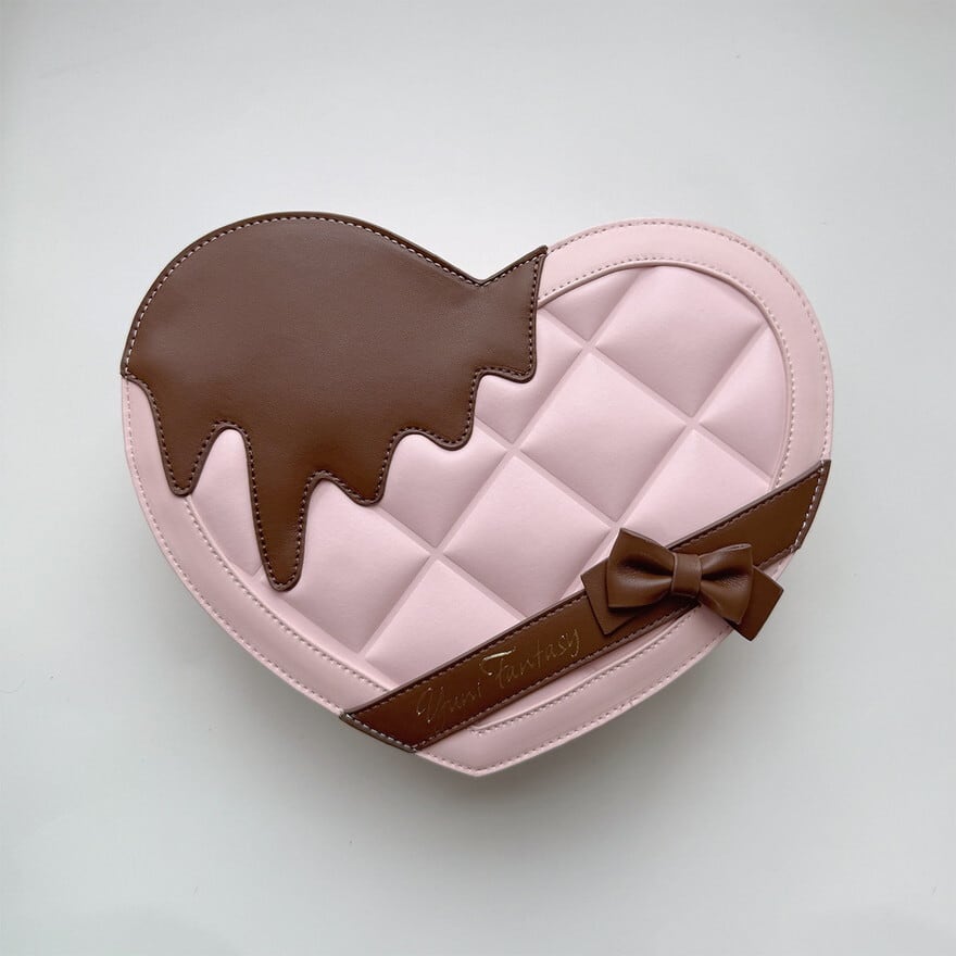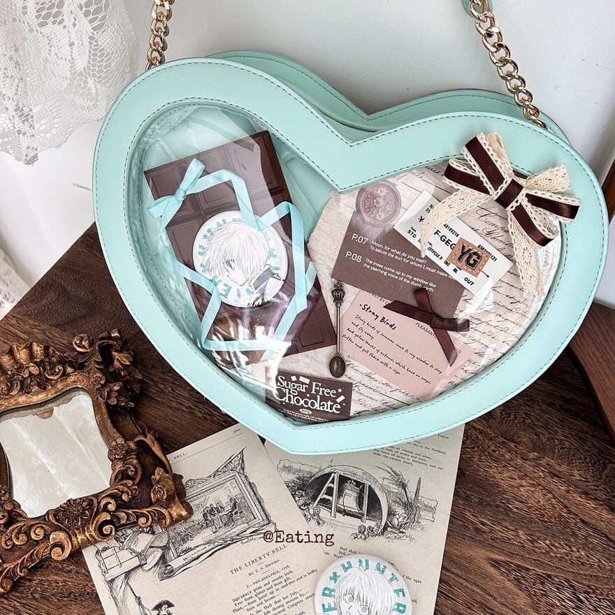 甘い板チョコのデザインとハート型の透明窓が特徴の、推し活とロリータファッションを上品に両立させたい方に最適な2way痛バッグです。