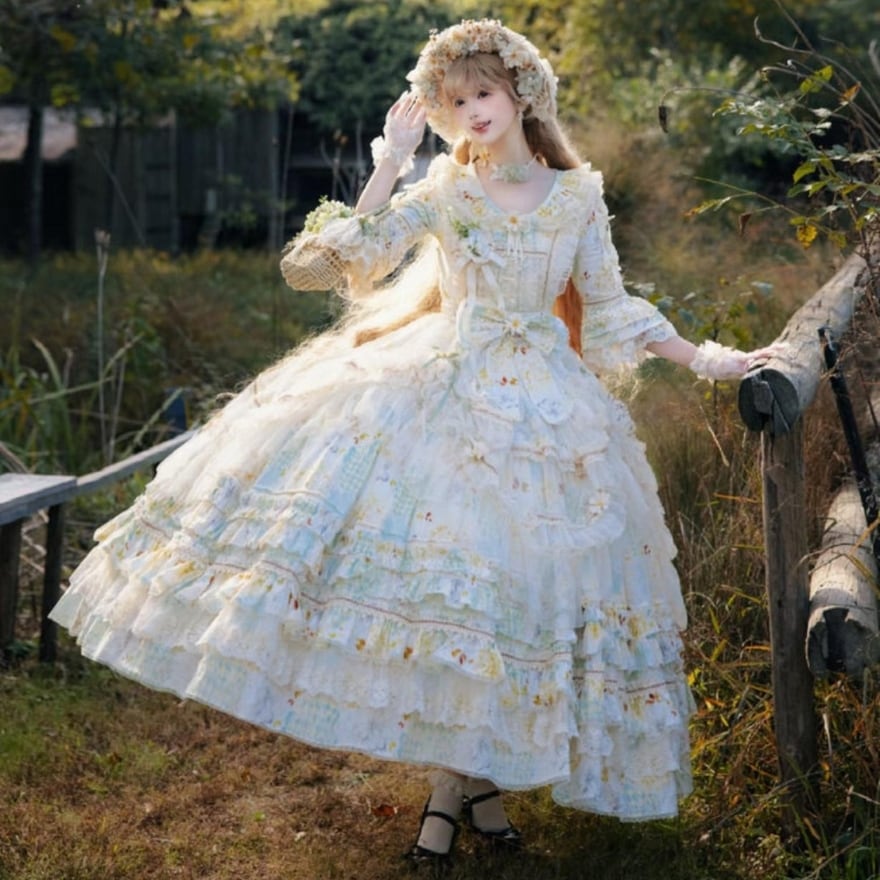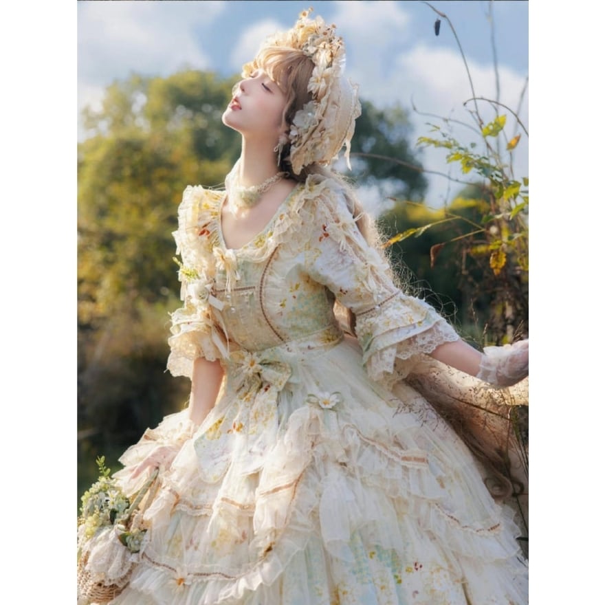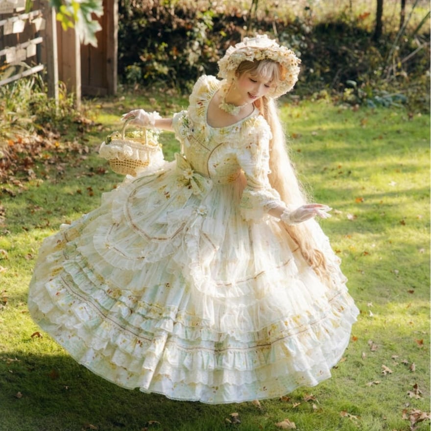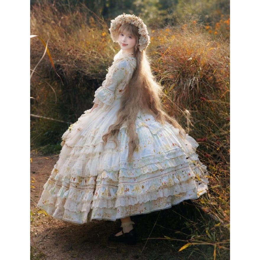 淡いフラワープリントと重なり合うフリルが印象的な、クラシカルロリィタのロングドレス。