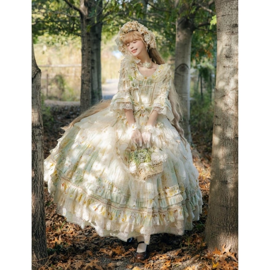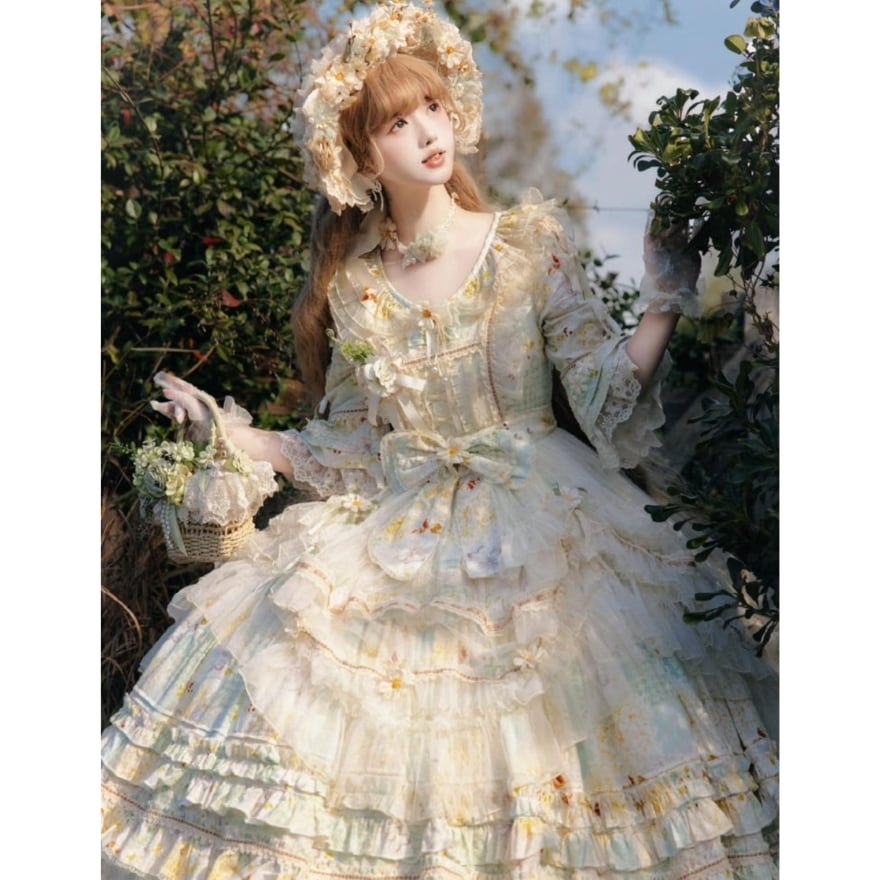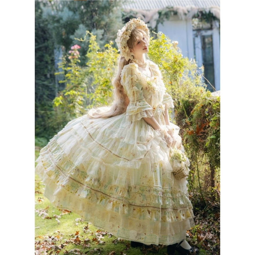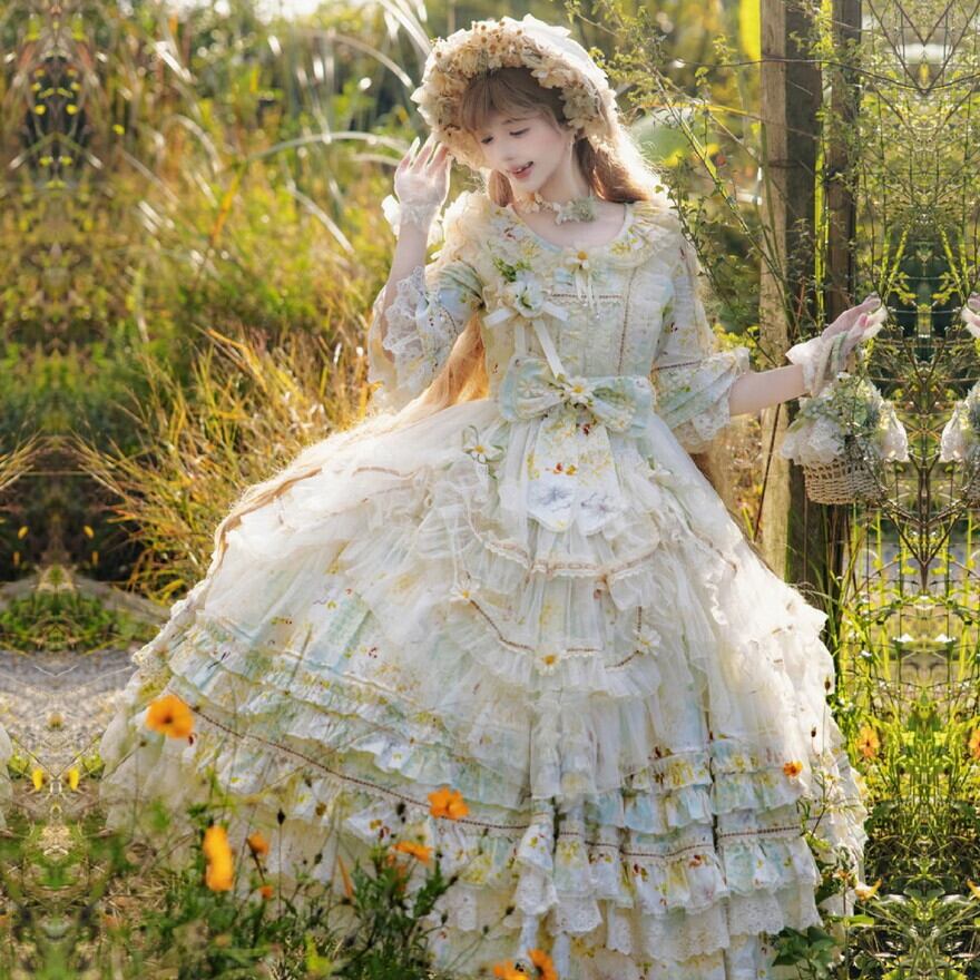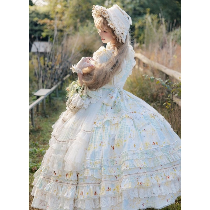 淡いフラワープリントと重なり合うフリルが印象的な、クラシカルロリィタのロングドレス。