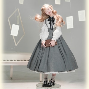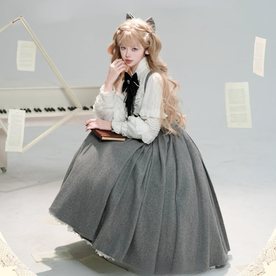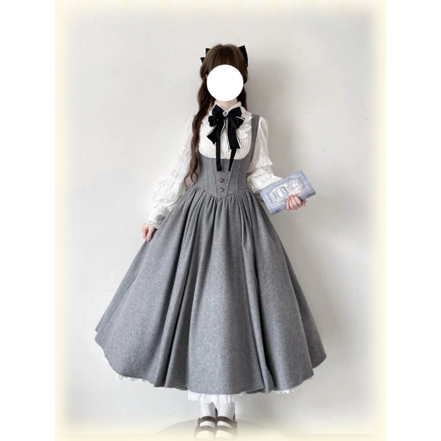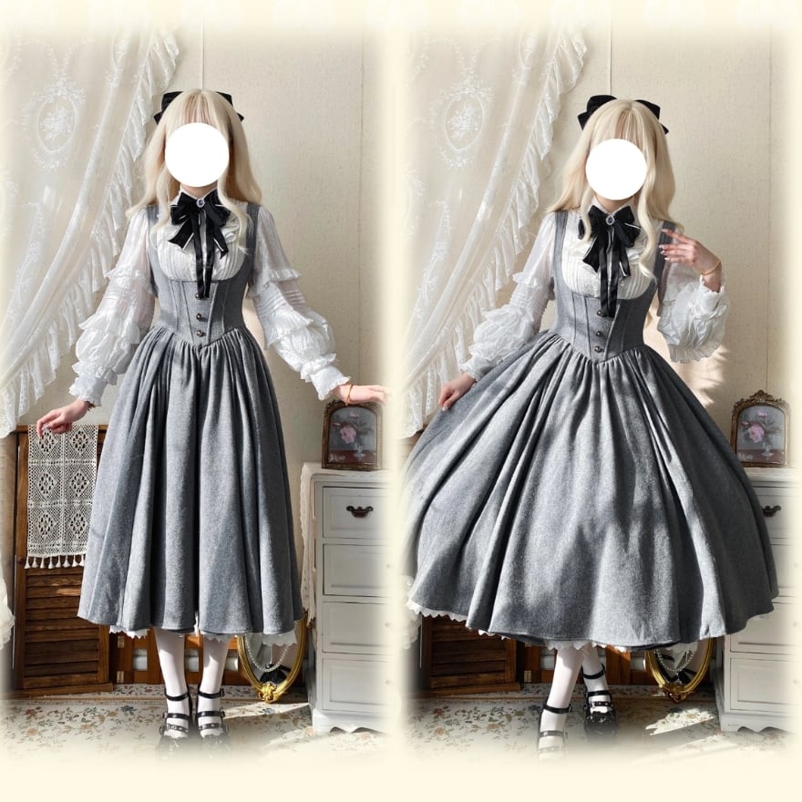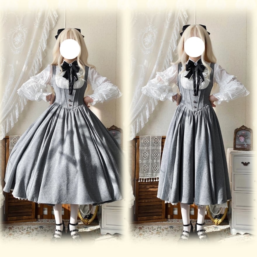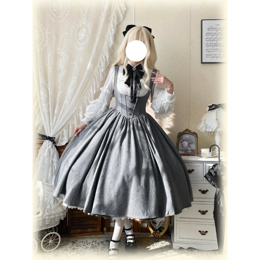 落ち着いたグレーを基調に、学院風の知性とクラシカルロリータの優雅さを融合させたJSKセットアップです。