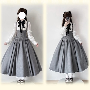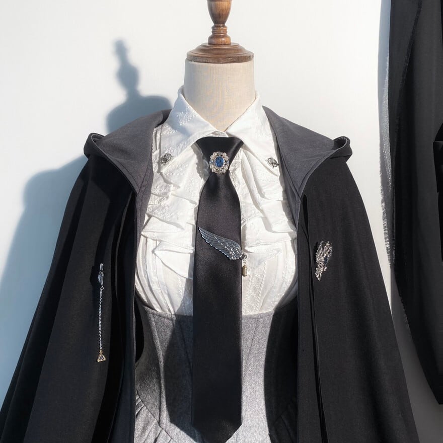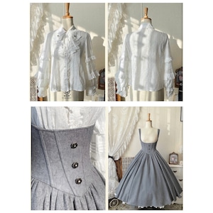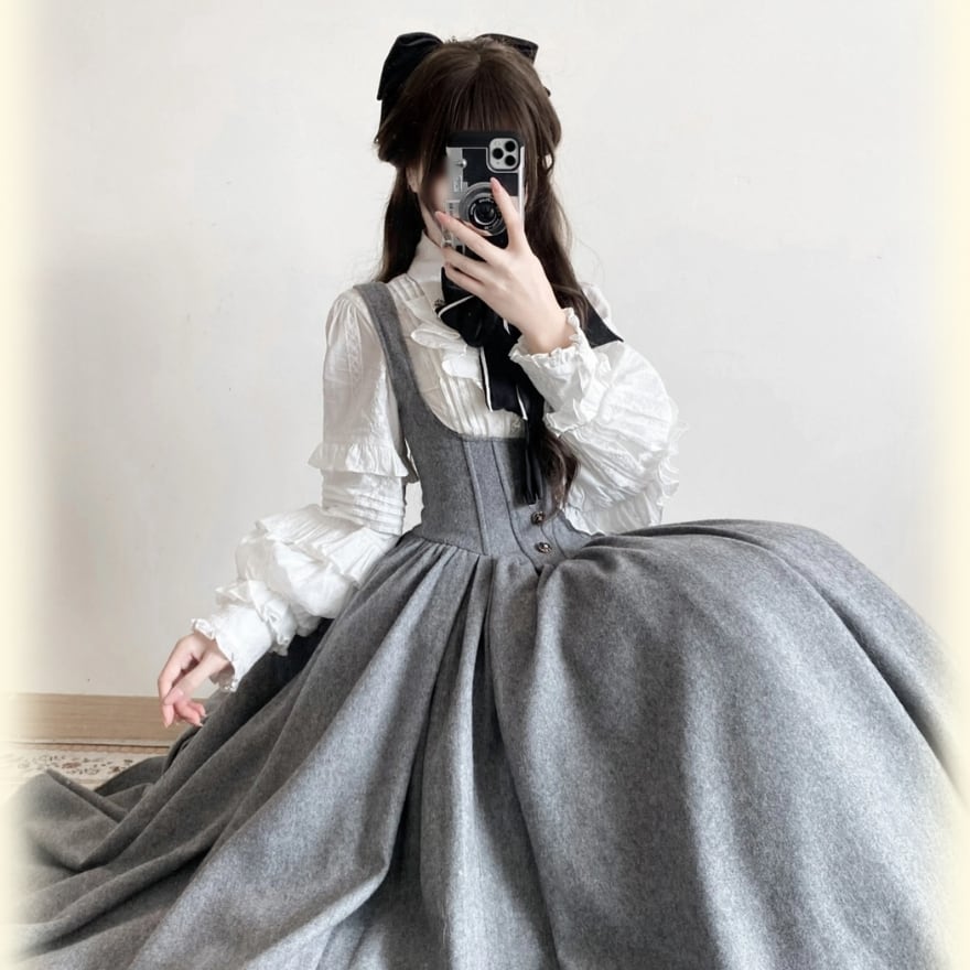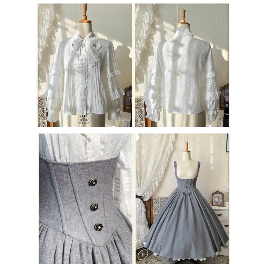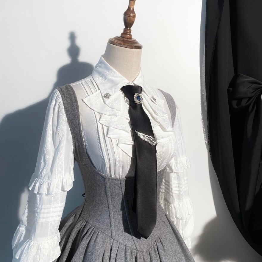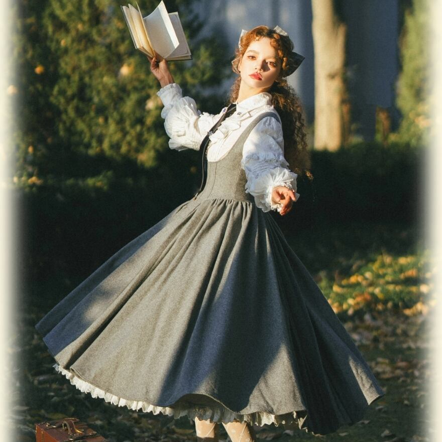 落ち着いたグレーを基調に、学院風の知性とクラシカルロリータの優雅さを融合させたJSKセットアップです。
