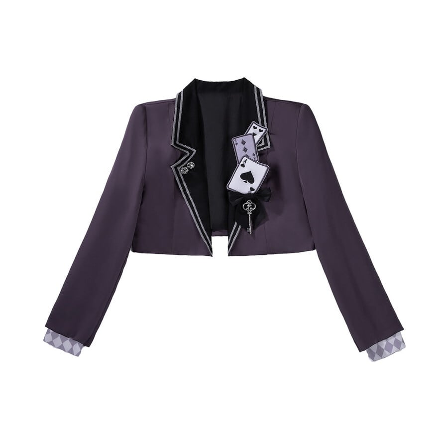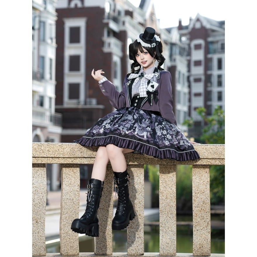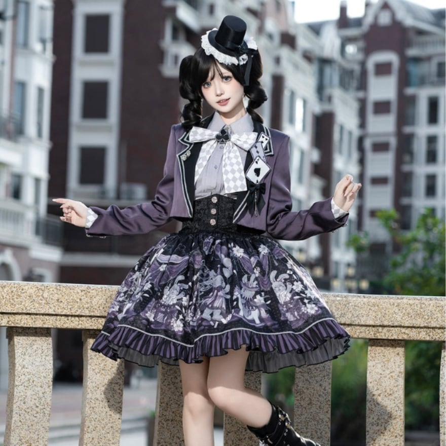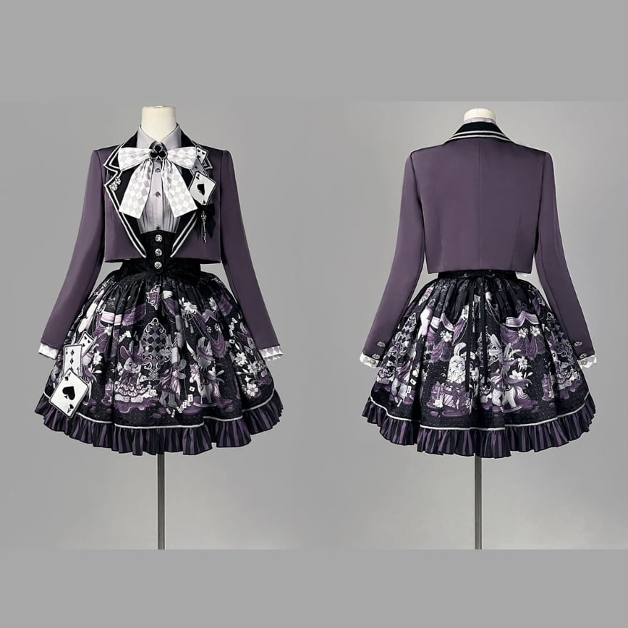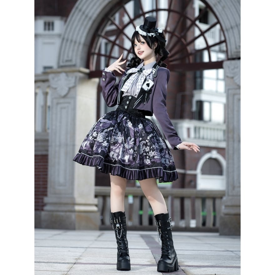トランプモチーフを繊細に描いたスカートに、ショートジャケットとリボン付きブラウスを合わせたクラシカルロリィタの3点セット。