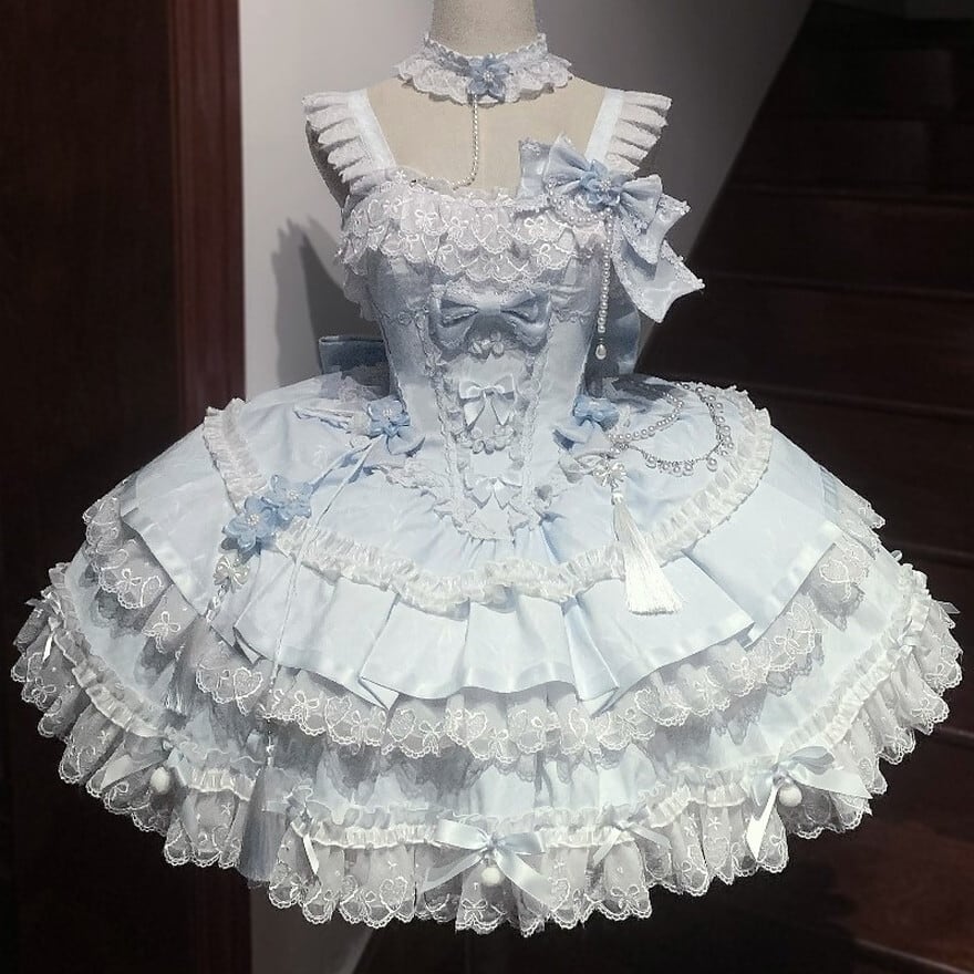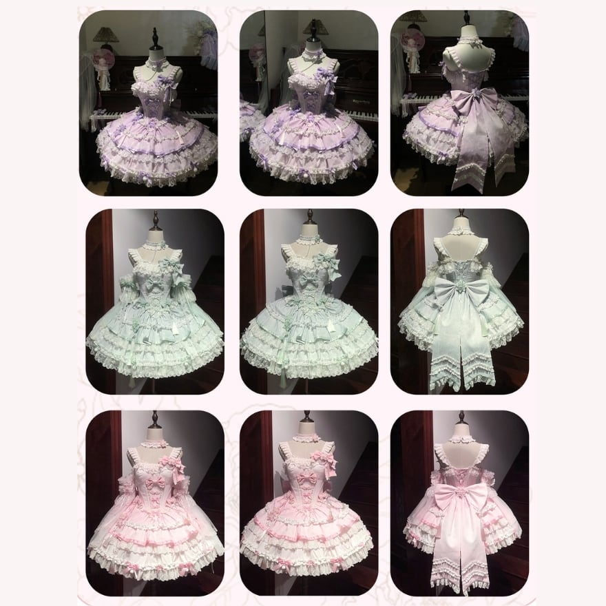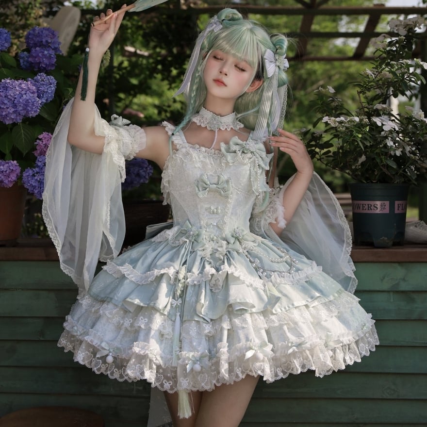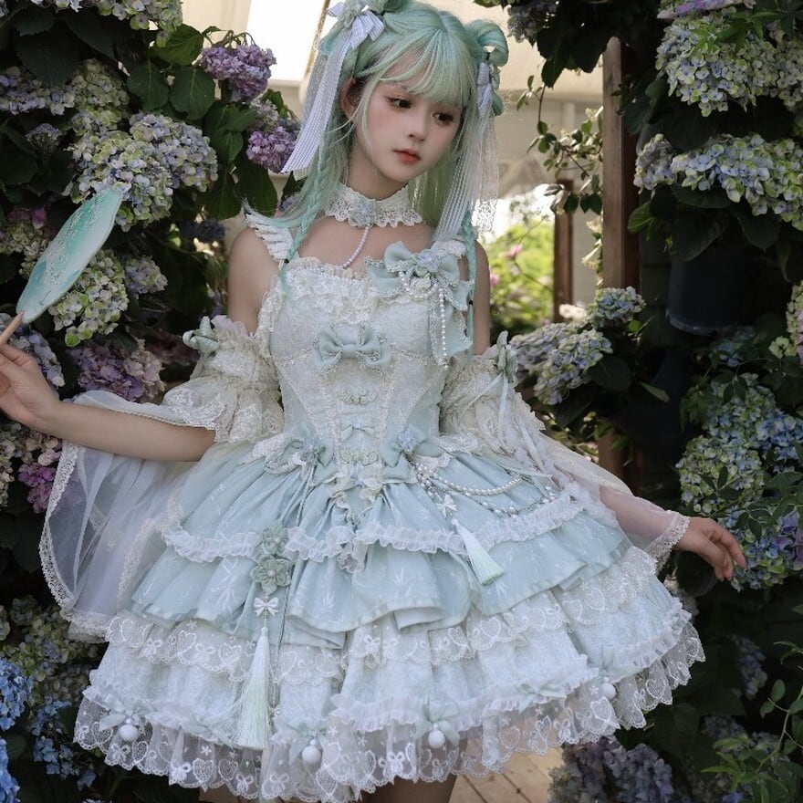 紫陽花に包まれた庭園を思わせる、淡いパステルカラーが印象的なクラシカルロリィタドレスです。