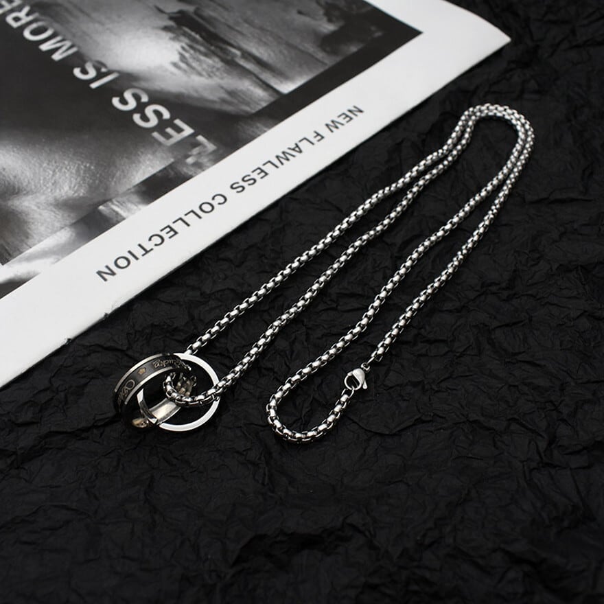 メタルモチーフが印象的なロングタイプのダブルリングモチーフのネックレスです。