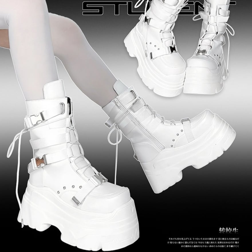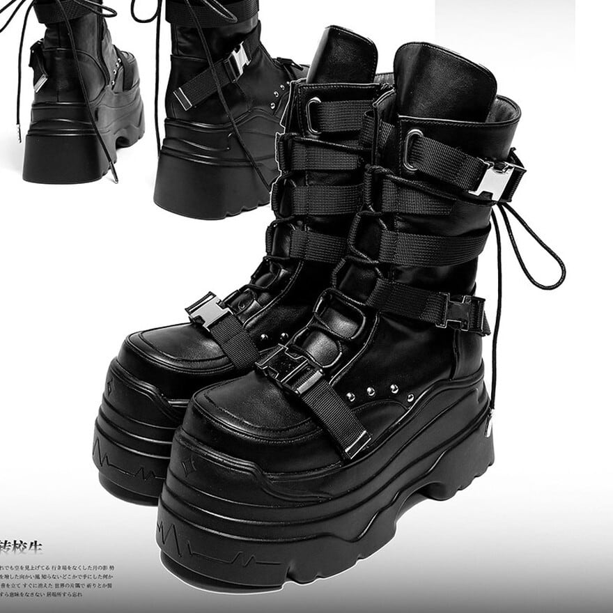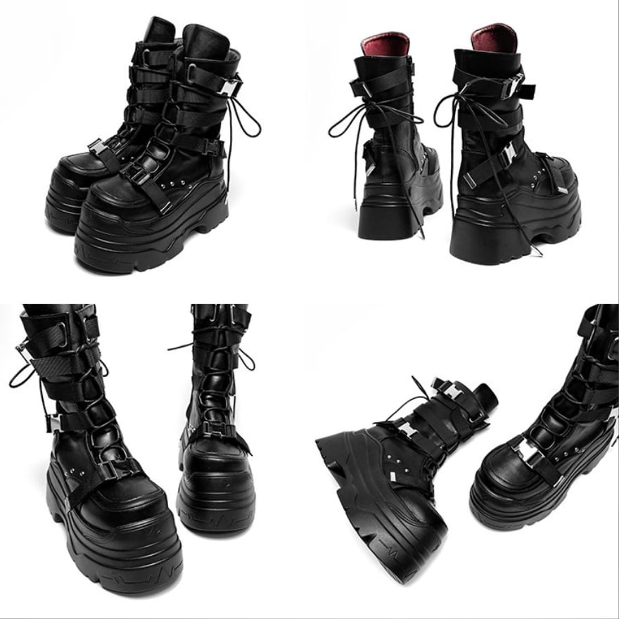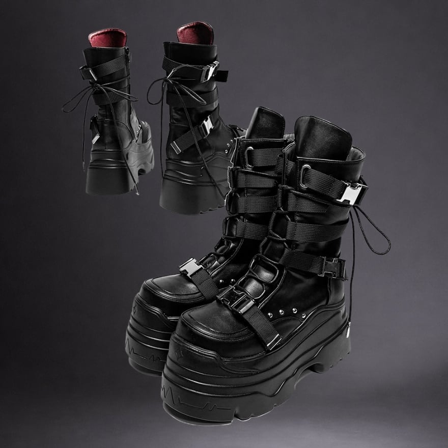 ゴシック・パンクの魂を宿した、圧倒的な存在感を放つ極厚底編み上げブーツ。